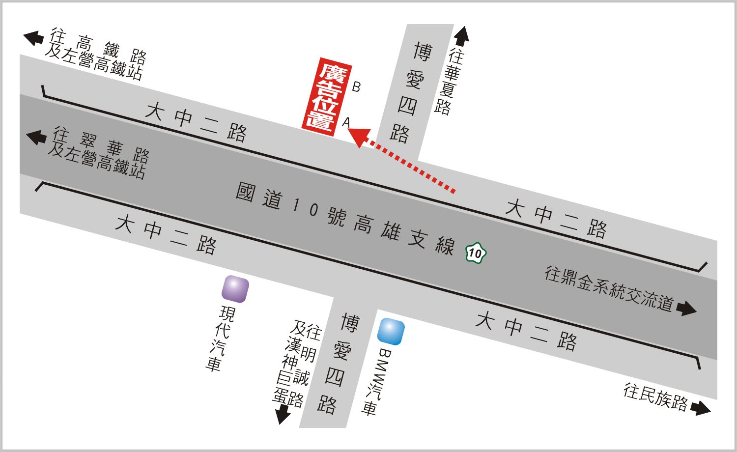 版面位於大中二路往高鐵路方向收視,此路段為連接高鐵路、民族路、華夏路及明誠路的主要道路之一,交通流量及往來車潮、人潮頻繁,其廣告版面位置醒目,凡行經該路段之人車皆能清楚收視,是戶外定點廣告投資的絕佳地段。