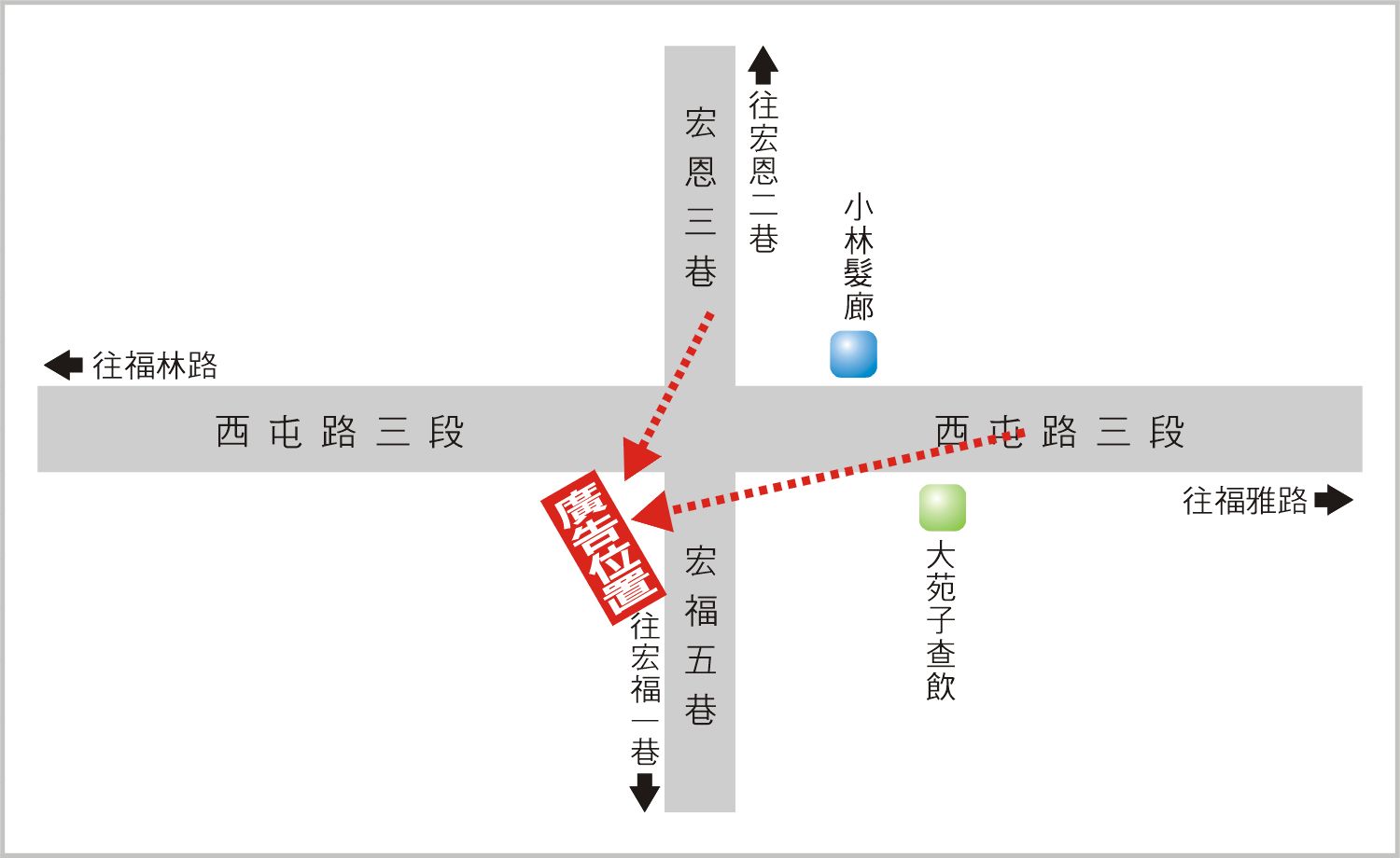 版面位於西屯路三段與宏福五巷往福林路方向收視,此路段為連接福雅路、福林路、宏恩三巷及宏福五巷的主要道路之一,交通流量及往來車潮、人潮頻繁,其廣告版面位置醒目,凡行經該路段之人車皆能清楚收視,是戶外定點廣告投資絕佳地段。