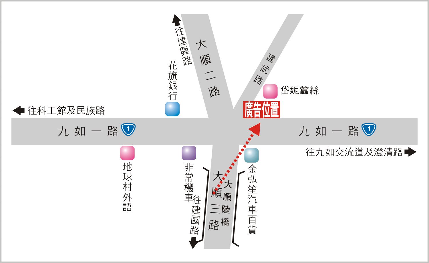 版面位於九如路與大順路口往建興路方向收視,此路段為台一線高雄段,連接高速公路、民族路、建國路及建興路的主要道路之一,交通流量及往來車潮、人潮都相當頻繁,其廣告版面位置醒目,凡行經該路段之人車皆能清楚收視,是戶外定點廣告投資的絕佳地段。