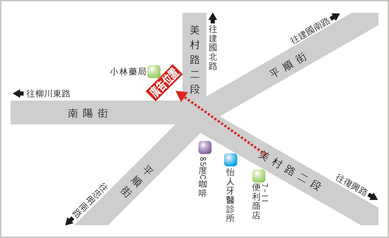 版面位於美村路二段與南陽街口往建國北路方向收視,此路段為連接建國北路、建國南路、復興路、忠明南路及柳川東路的主要道路之一,交通流量及往來車潮、人潮頻繁,其廣告版面位置醒目,凡行經該路段之人車皆能清楚收視,是戶外定點廣告投資的絕佳地段。