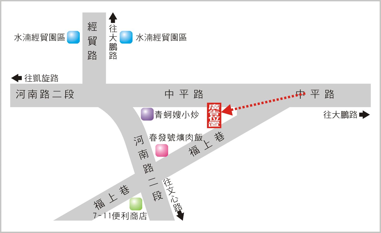 版面位於中平路與福上巷路口往凱旋路方向收視,此路段為連接凱旋路、經貿路、大鵬路及文心路的主要道路之一,交通流量及往來車潮、人潮頻繁,其廣告版面位置醒目,凡行經該路段之人車皆能清楚收視,是戶外定點廣告投資的絕佳地段。