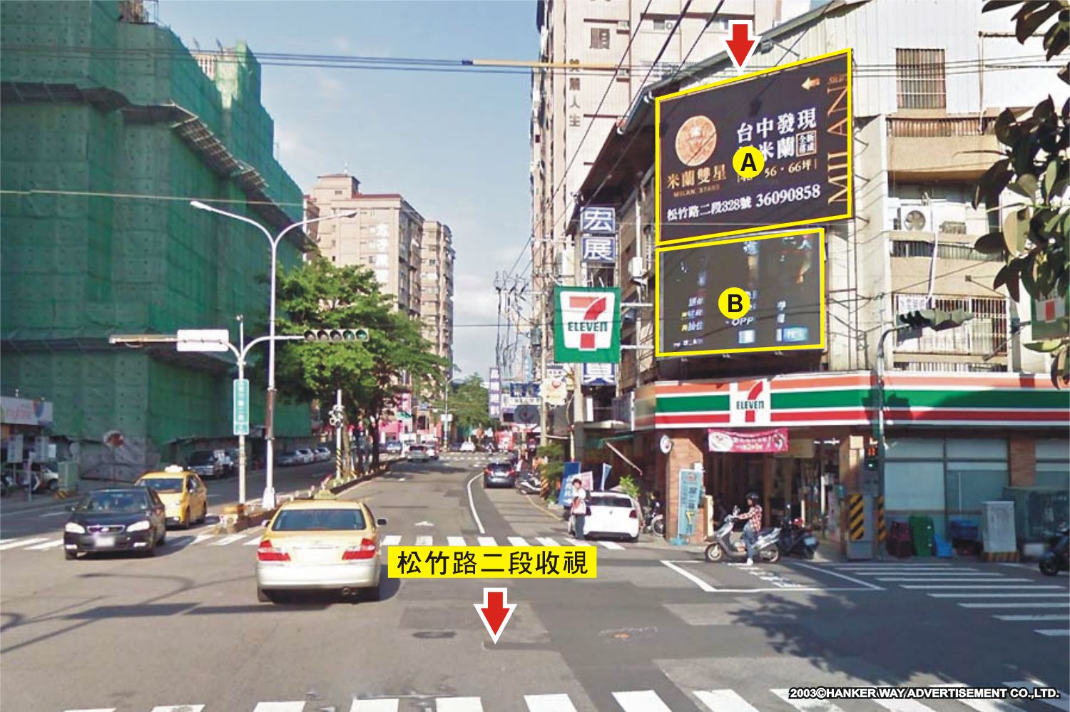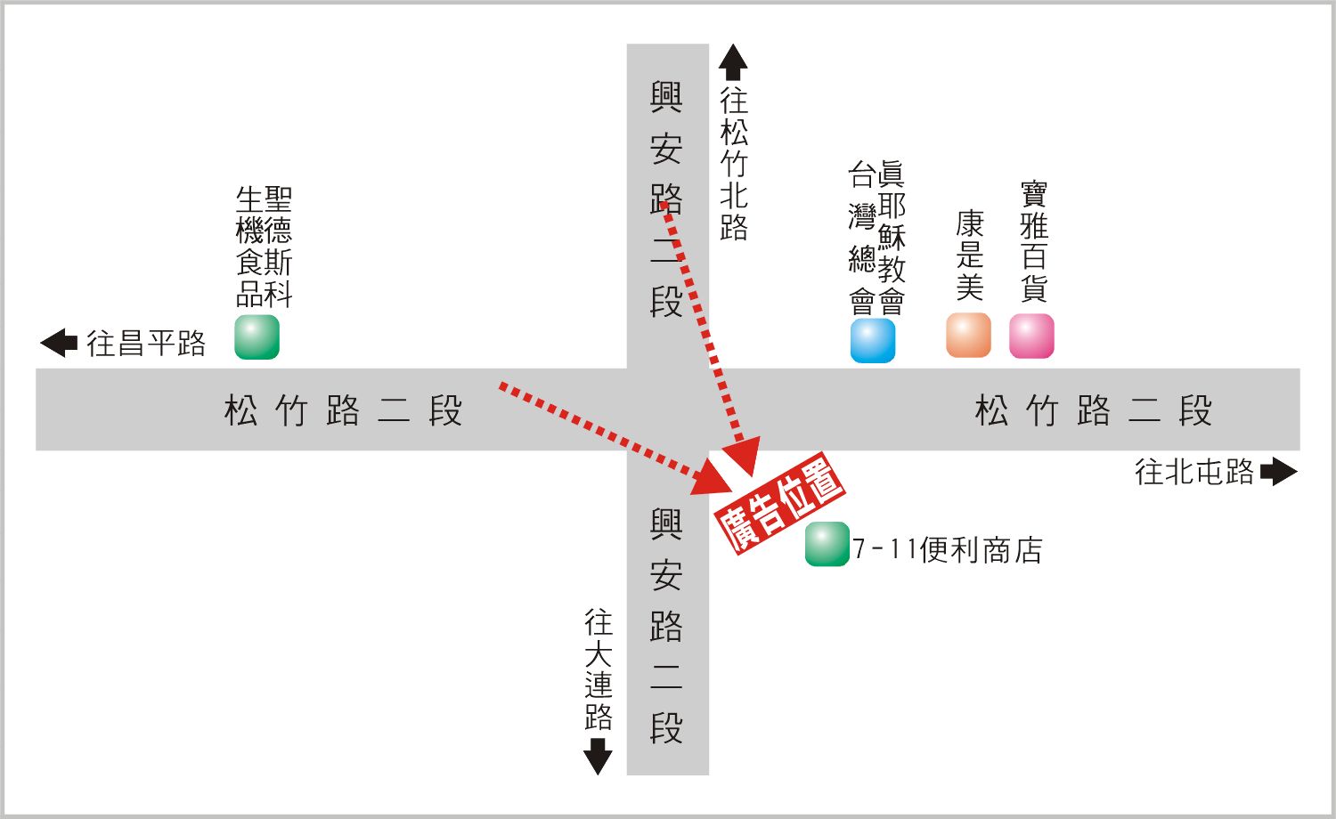 版面位於松竹路二段與興安路二段路口往大連路及北屯路方向收視,此路段為連接北屯路、昌平路、松竹北路及大連路的主要道路之一,交通流量及往來車潮、人潮頻繁,其廣告版面位置醒目,凡行經該路段之人車皆能清楚收視,是戶外定點廣告投資的絕佳地段。