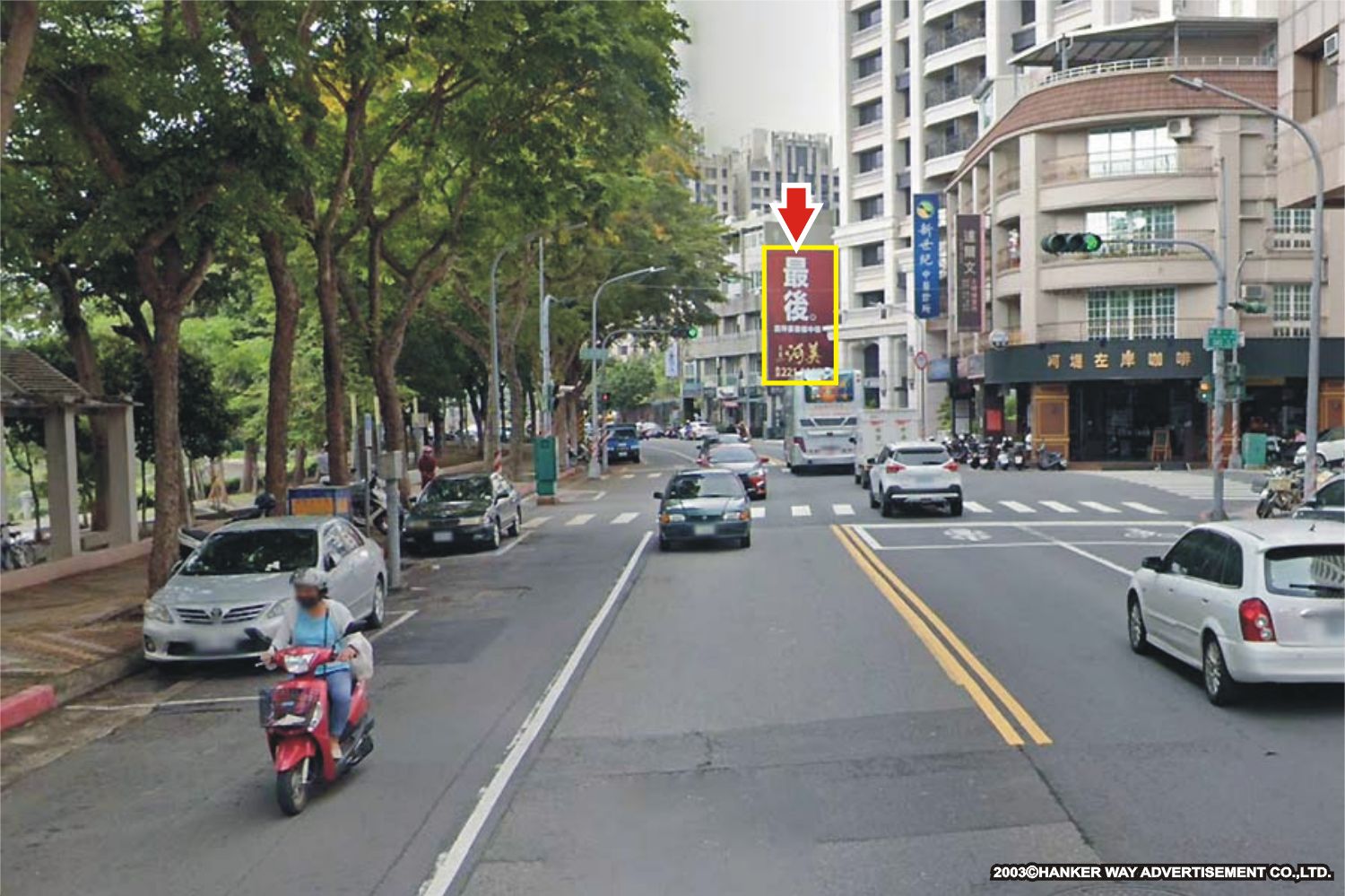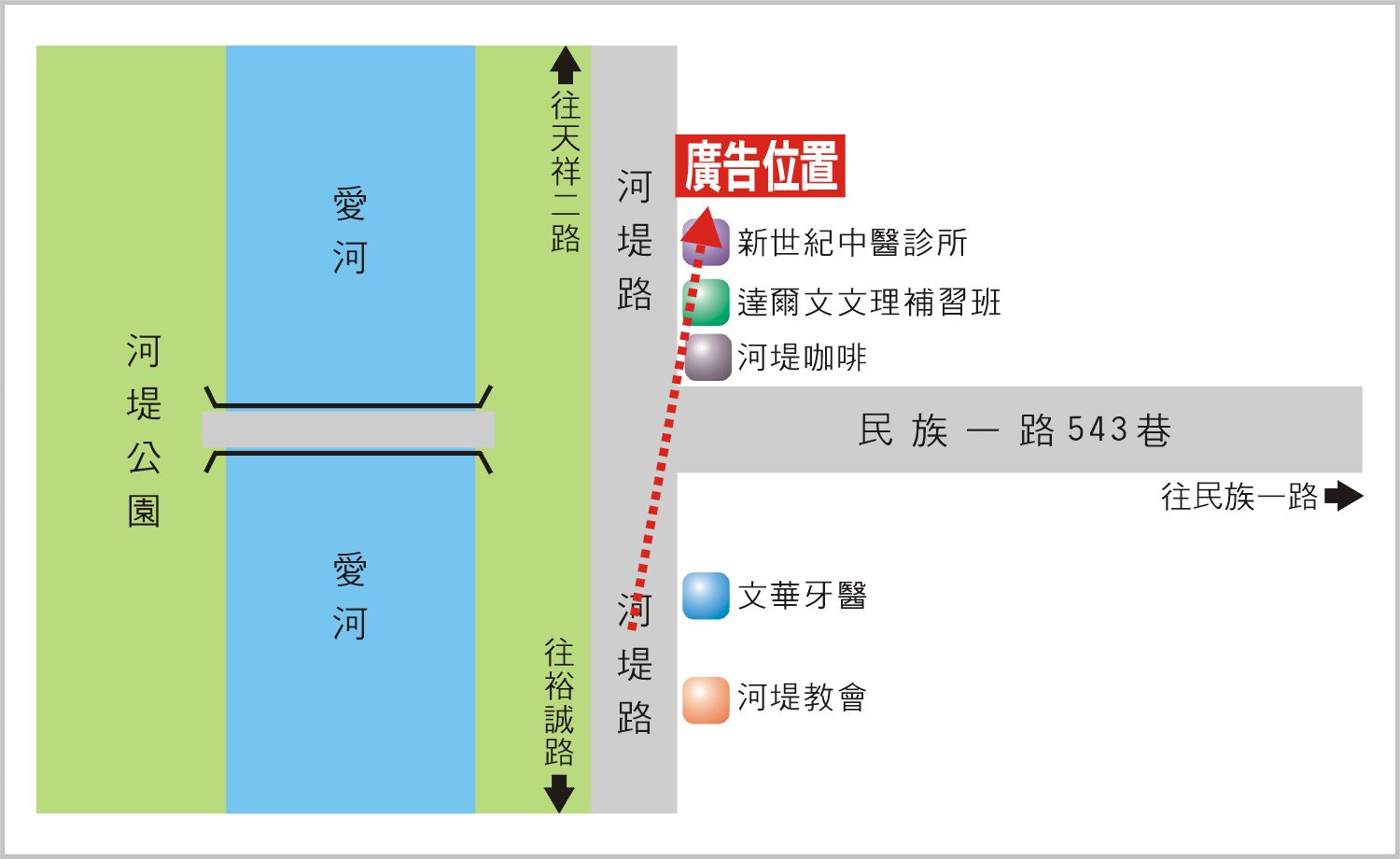 版面位於河堤路往天祥二路方向收視,此路段為連接裕誠路、天祥二路及民族一路的主要道路之一,交通流量及往來車潮、人潮頻繁,其廣告版面位置醒目,凡行經該路段之人車皆能清楚收視,是戶外定點廣告投資的絕佳地段。