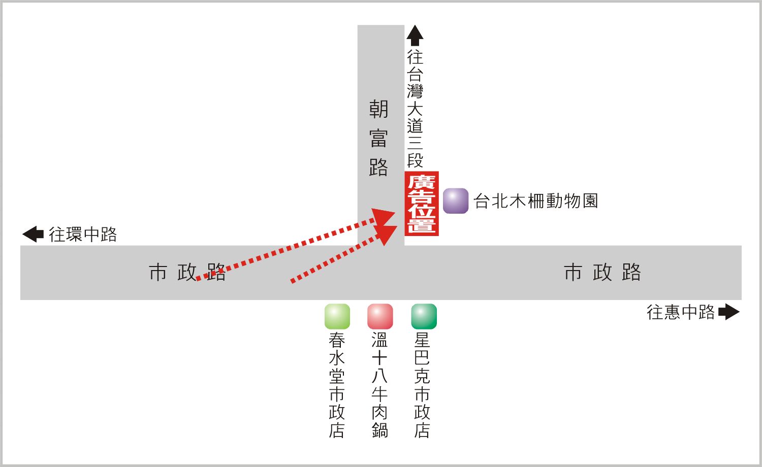 版面位於市政路與朝富路口往惠中路方向收視,此路段為連接環中路、惠中路及台灣大道三段的主要道路之一,交通流量及往來車潮、人潮頻繁,其廣告版面位置醒目,凡行經該路段之人車皆能清楚收視,是戶外定點廣告投資的絕佳地段。