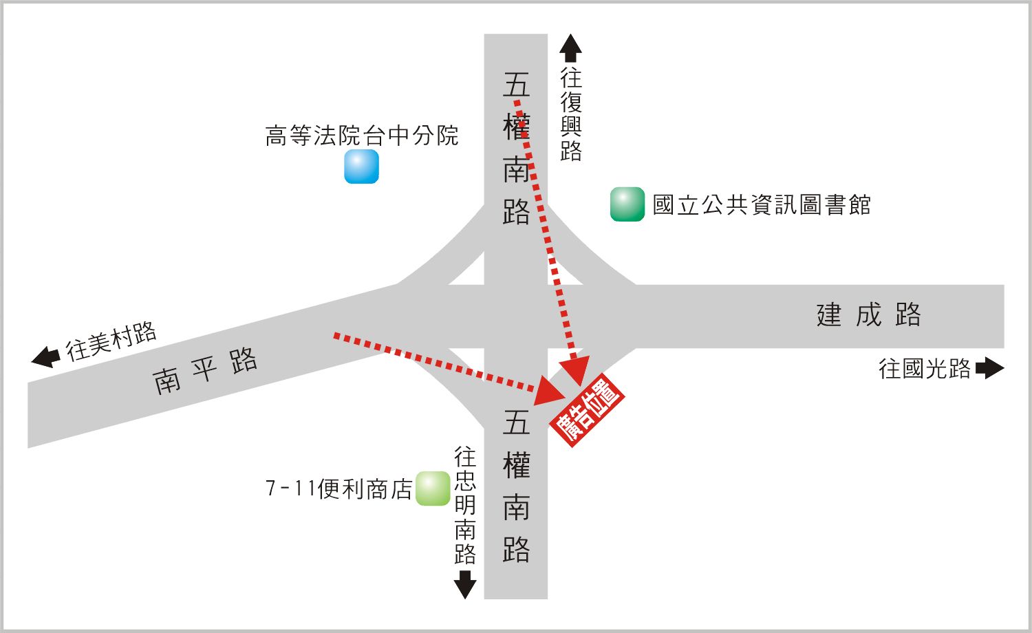 版面位於五權南路與建成路口往忠明南路與國光路往方向收視,此路段為連接國光路、美村路、忠明南路及復興路的主要道路之一,交通流量及往來車潮、人潮頻繁,其廣告版面位置醒目,凡行經該路段之人車皆能清楚收視,是戶外定點廣告投資的絕佳地段。