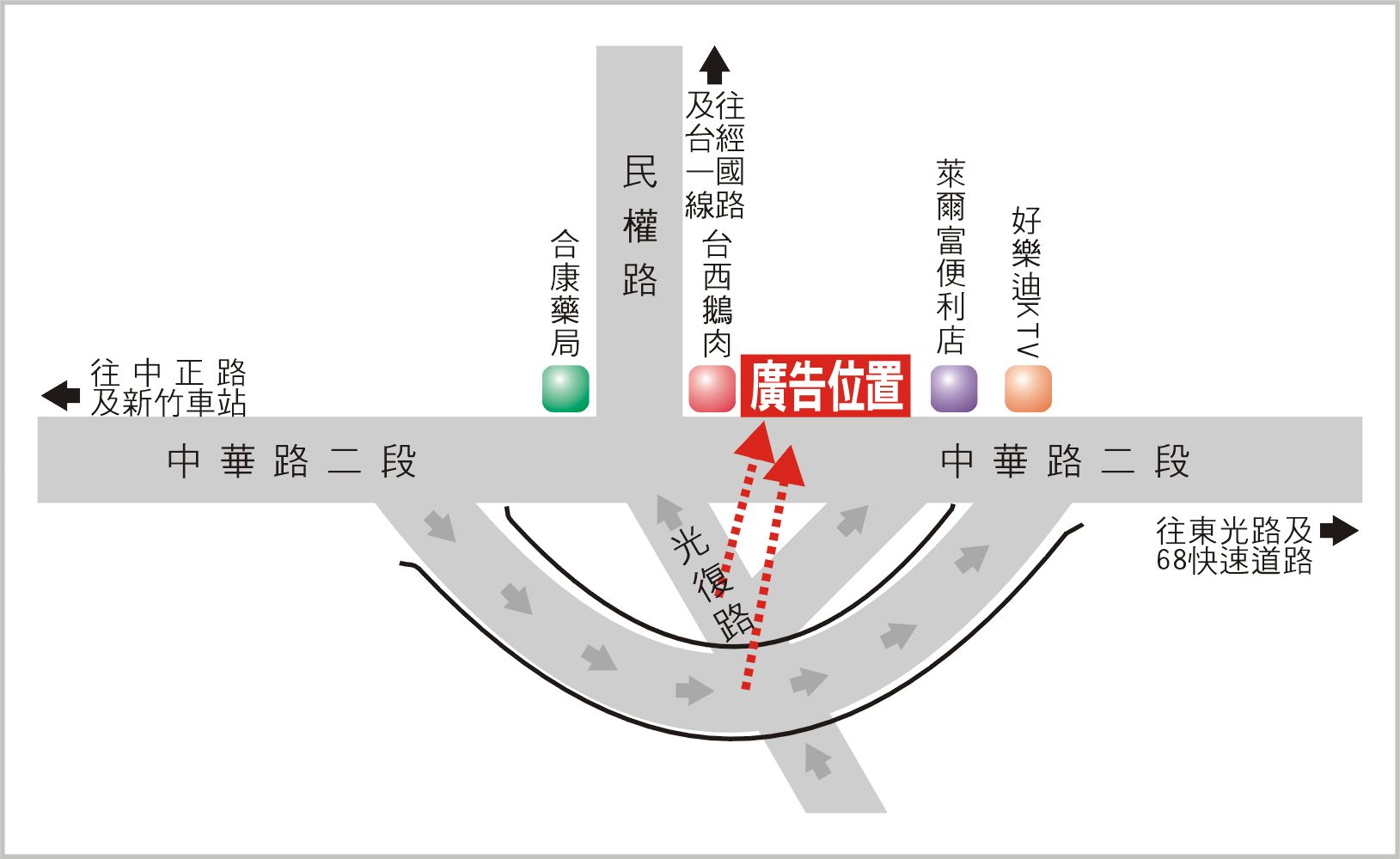 版面位於中華路二段與民權路口路往經國路方向收視,此路段為連接東光路、68快速道路、中正路、新竹車站路及經國路的主要道路之一,交通流量及往來車潮、人潮頻繁,其廣告版面位置醒目,凡行經該路段之人車皆能清楚收視,是戶外定點廣告投資的絕佳地段。