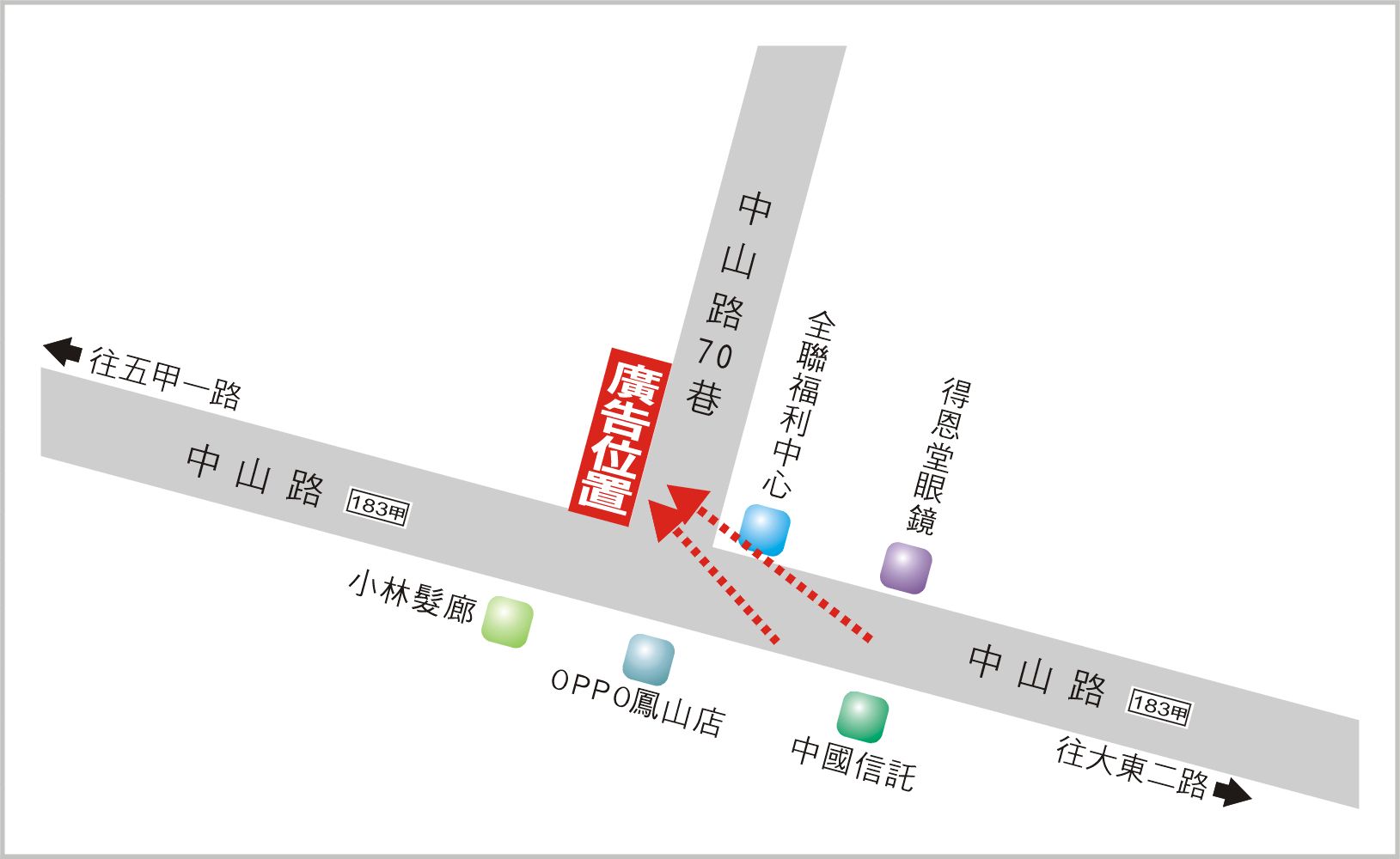 版面位於鳳山區中山路往五甲一路方向收視,此路段為連接五甲一路及大東二路的主要道路之一,交通流量及往來車潮、人潮頻繁,其廣告版面位置醒目,凡行經該路段之人車皆能清楚收視,是戶外定點廣告投資的絕佳地段。