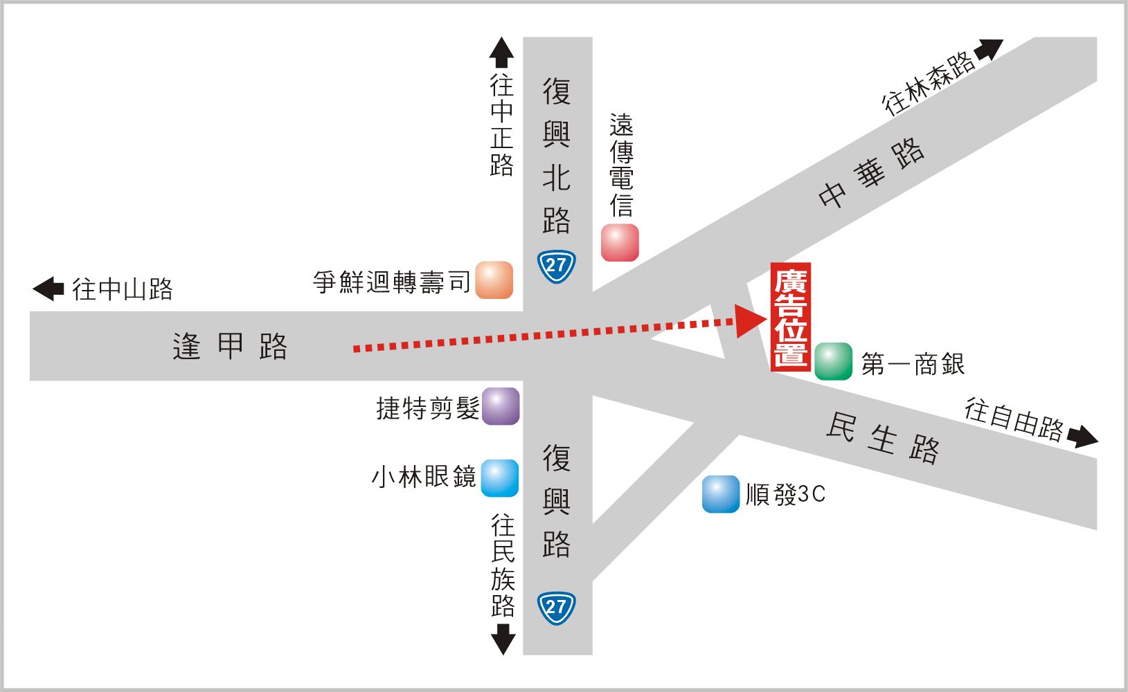 版面位於屏東市中華路與民生路口路衝收視,此路段為連接中山路、自由路、民族路及林森路的主要道路之一,交通流量及往來車潮、人潮頻繁,其廣告版面位置醒目,凡行經該路段之人車皆能清楚收視,是戶外定點廣告投資的絕佳地段。
