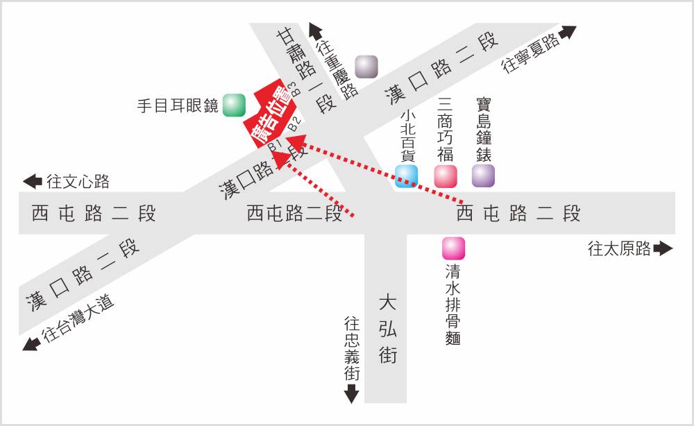 版面位於河南路四段與大墩11街口往公益路文心路方向收視,此路段為連接黎明路、文心路、公益路及向上路的主要道路之一,交通流量及往來車潮、人潮頻繁,其廣告版面位置醒目,凡行經該路段之人車皆能清楚收視,是戶外定點廣告投資的絕佳地段。