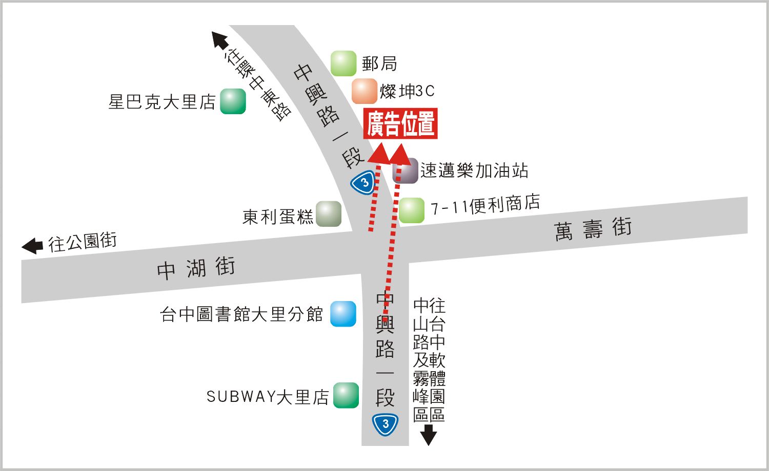 版面位於中興路一段往環中東路方向收視,此路段為台三線大里段,連接環中東路、台中軟體園區、中山路、霧峰區及公園街的主要道路之一,交通流量及往來車潮、人潮頻繁,其廣告版面位置醒目,凡行經該路段之人車皆能清楚收視,是戶外定點廣告投資的絕佳地段。