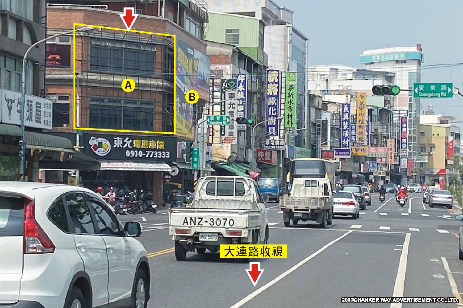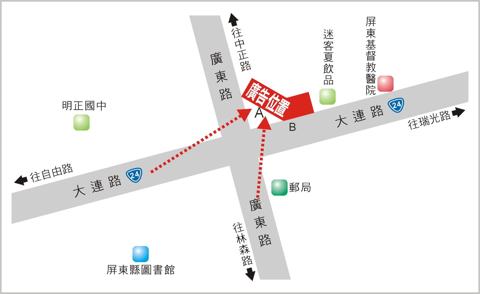 版面位於屏東市廣東路與大連路口往中正路與瑞光路方向收視,此路段為台24線屏東段,連接中正路、林森路、瑞光路及自由路的主要道路之一,腹地為屏縣圖書館,交通流量及往來車潮、人潮頻繁,其廣告版面位置醒目,凡行經該路段之人車皆能清楚收視,是戶外定點廣告投資的絕佳地段。