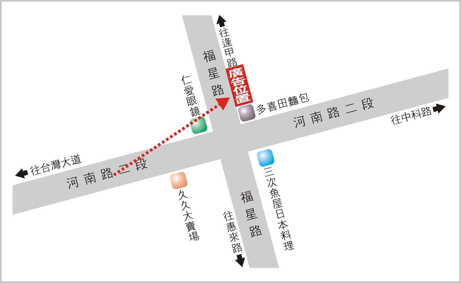 版面位於福星路與河南路口往中科路方向收視,此路段為連接台灣大道、中科路、逢甲路及惠來路的主要道路之一,交通流量及往來車潮、人潮頻繁,其廣告版面位置醒目,凡行經該路段之人車皆能清楚收視,是戶外定點廣告投資的絕佳地段。