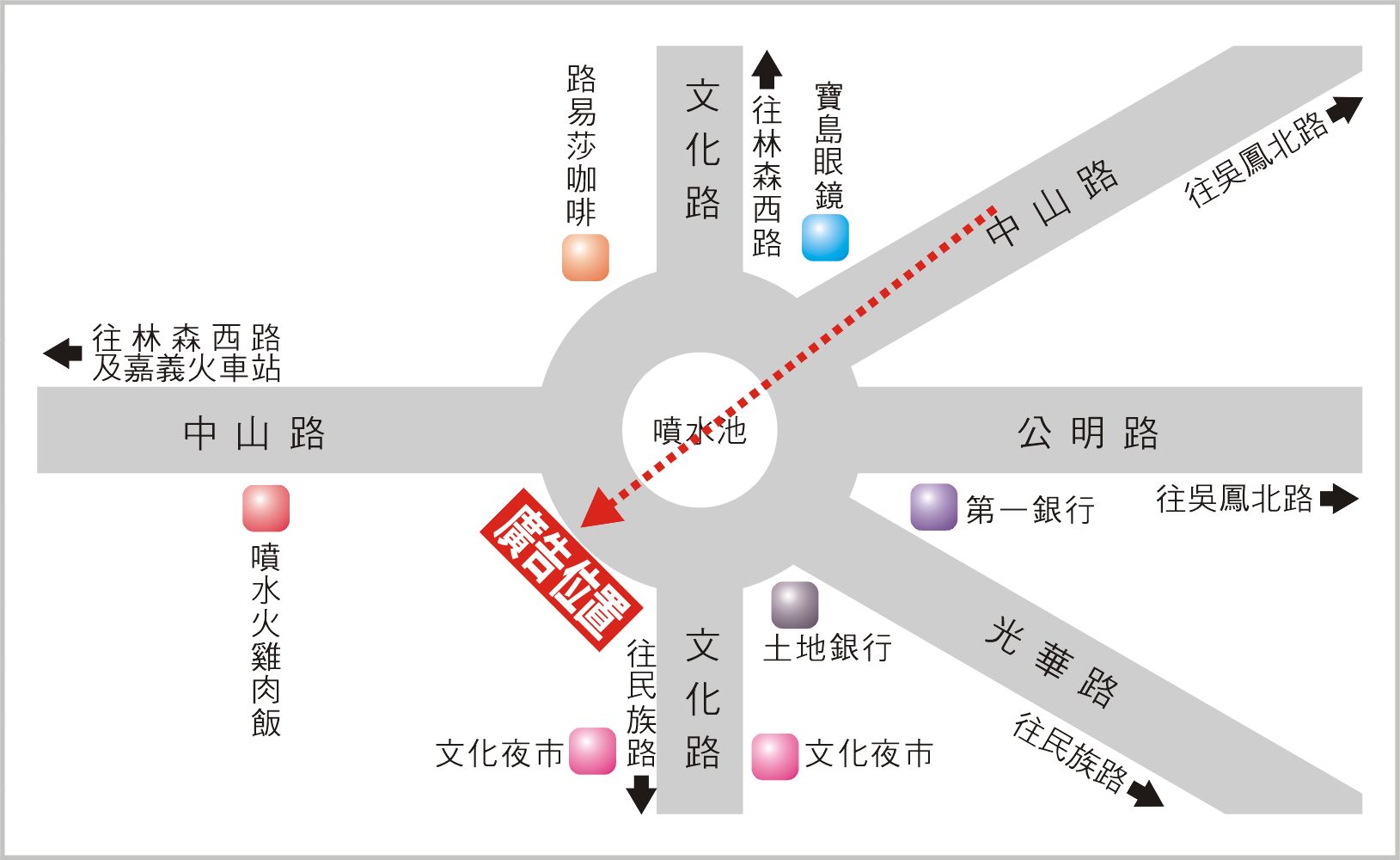 版面位於嘉義市中山路往噴水池方向收視,此路段為連接嘉義火車站、林森西路、民族路、文化路及吳鳳北路的主要道路之一,交通流量及往來車潮、人潮都頻繁,其廣告版面位置醒目,凡行經該路段之人車皆能清楚收視,是戶外定點廣告投資的絕佳地段。