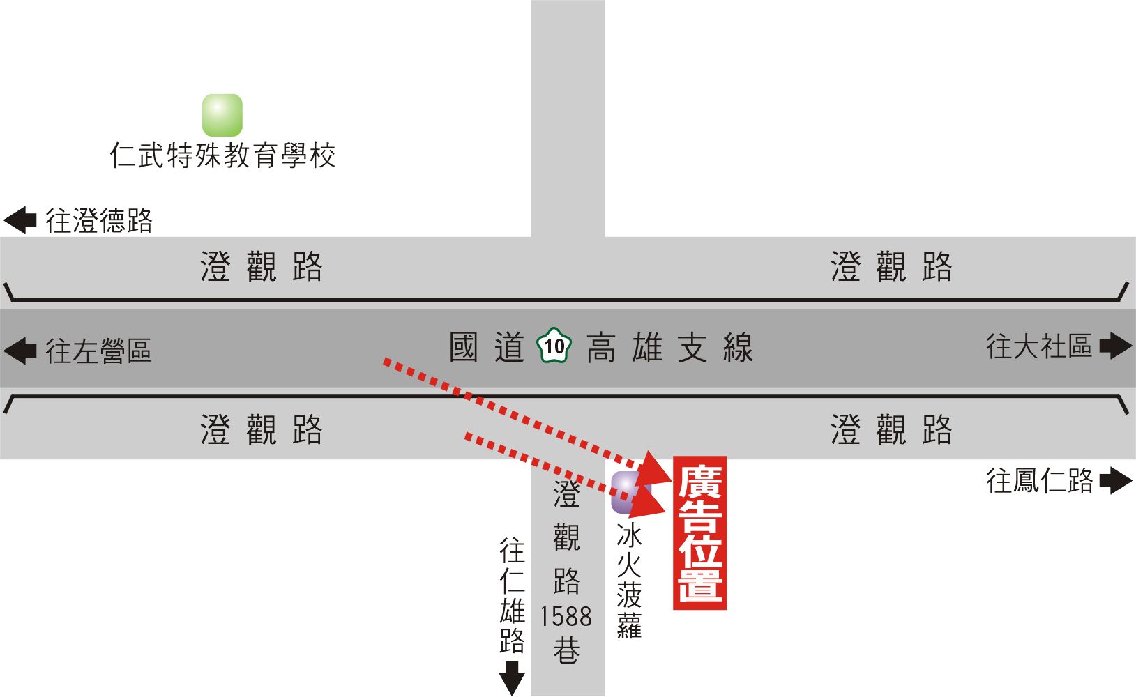 版面位於仁武區澄觀路1588巷旁路口往鳳仁方向收視,此路段為連接大社區、鳳仁路、左營區路及澄德路的主要道路之一,在國道10號高雄支線往大社區及澄觀路往鳳仁路皆能收視,交通流量及往來車潮、人潮頻繁,其廣告版面位置醒目,凡行經該路段之人車皆能清楚收視,是戶外定點廣告投資的絕佳地段。