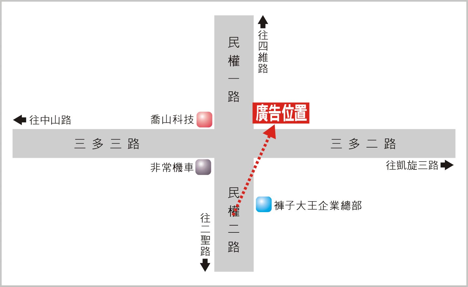版面位於民權一路與三多二路口往四維路方向收視,此路段為連接中山路、凱旋三路、四維路及二聖路的主要道路之一,交通流量及往來車潮、人潮頻繁,其廣告版面位置醒目,凡行經該路段之人車皆能清楚收視,是戶外定點廣告投資的絕佳地段。