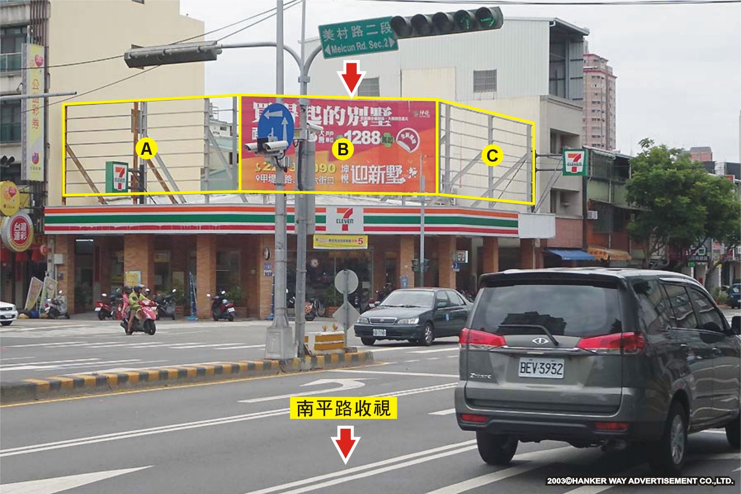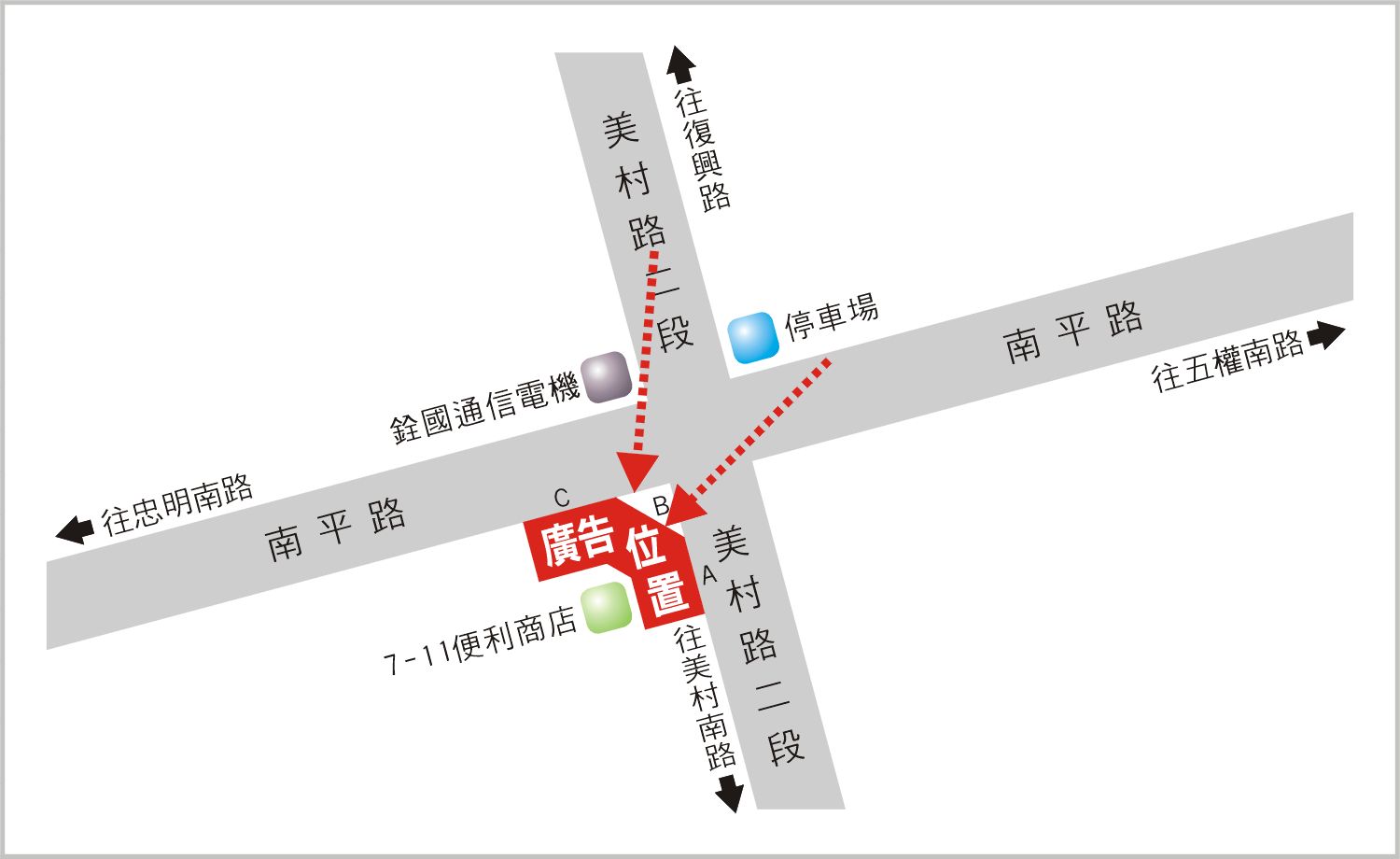 版面位於美村路二段與南平路口往忠明南路及美村南路方向收視,此路段為連接美村南路、復興路、忠明南路及五權南路的主要道路之一,交通流量及往來車潮、人潮頻繁,其廣告版面位置醒目,凡行經該路段之人車皆能清楚收視,是戶外定點廣告投資的絕佳地段。