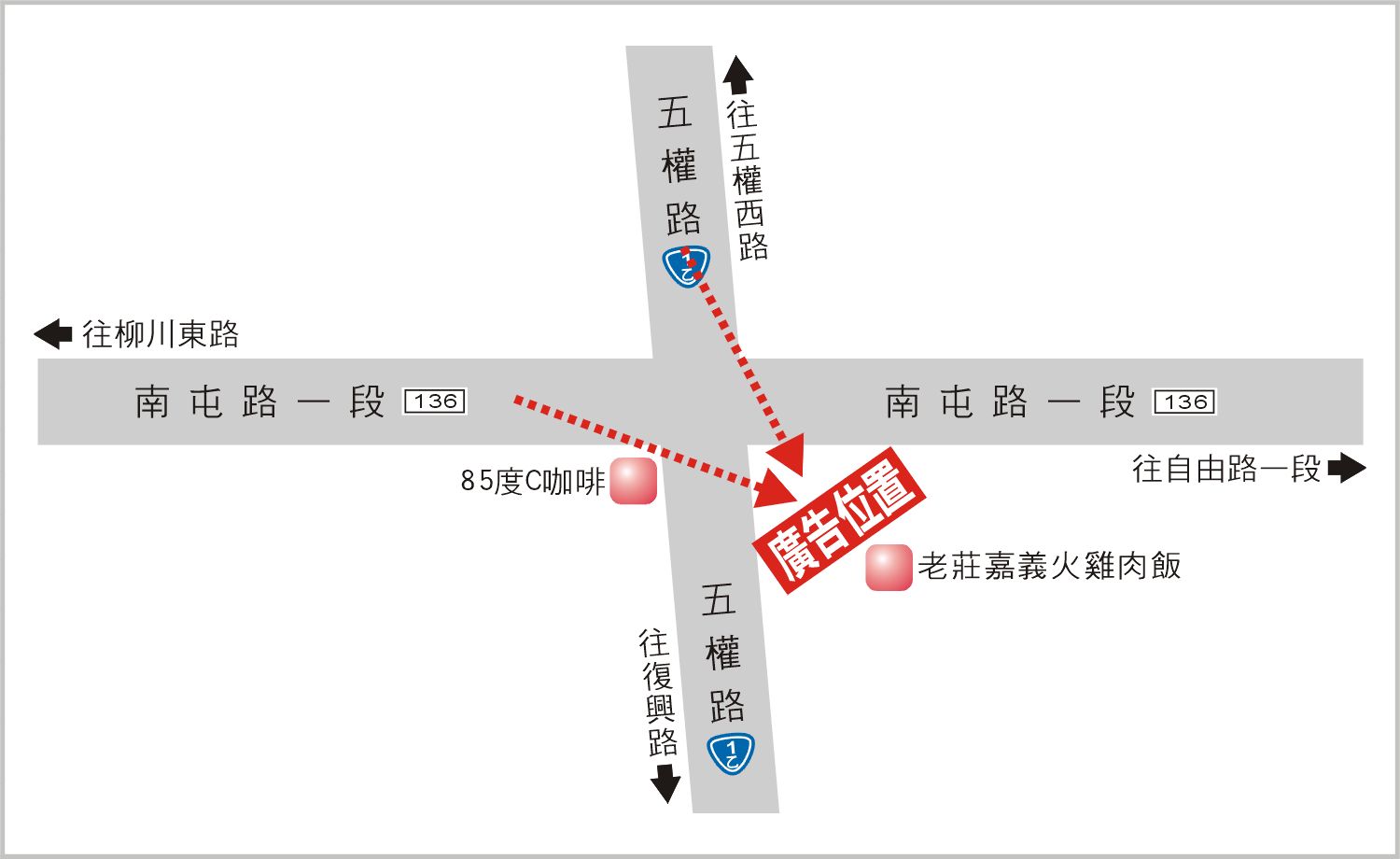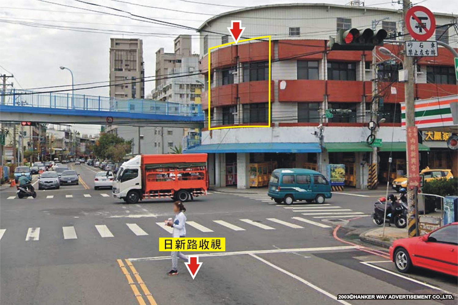 版面位於新仁路二段與日新路口往德芳路及東榮路方向收視,此路段為連接環中東路、德芳路一段、東昇路及東榮路的主要道路之一,交通流量及往來車潮、人潮頻繁,其廣告版面位置醒目,凡行經該路段之人車皆能清楚收視,是戶外定點廣告投資的絕佳地段。