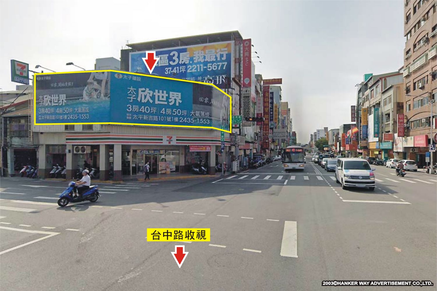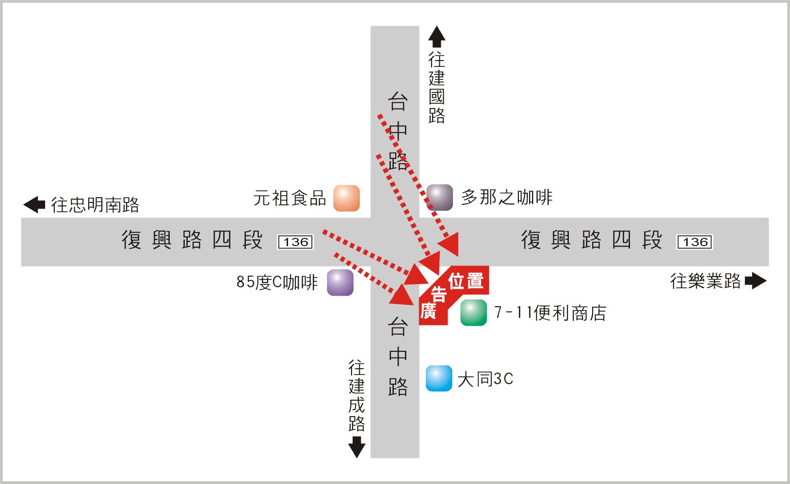 版面位於復興路四段及台中路口往樂業路及建成路方向收視,此路段為連接樂業路、忠明南路、建成路及建國路的主要道路之一,交通流量及往來車潮、人潮頻繁,其廣告版面位置醒目,凡行經該路段之人車皆能清楚收視,是戶外定點廣告投資的絕佳地段。