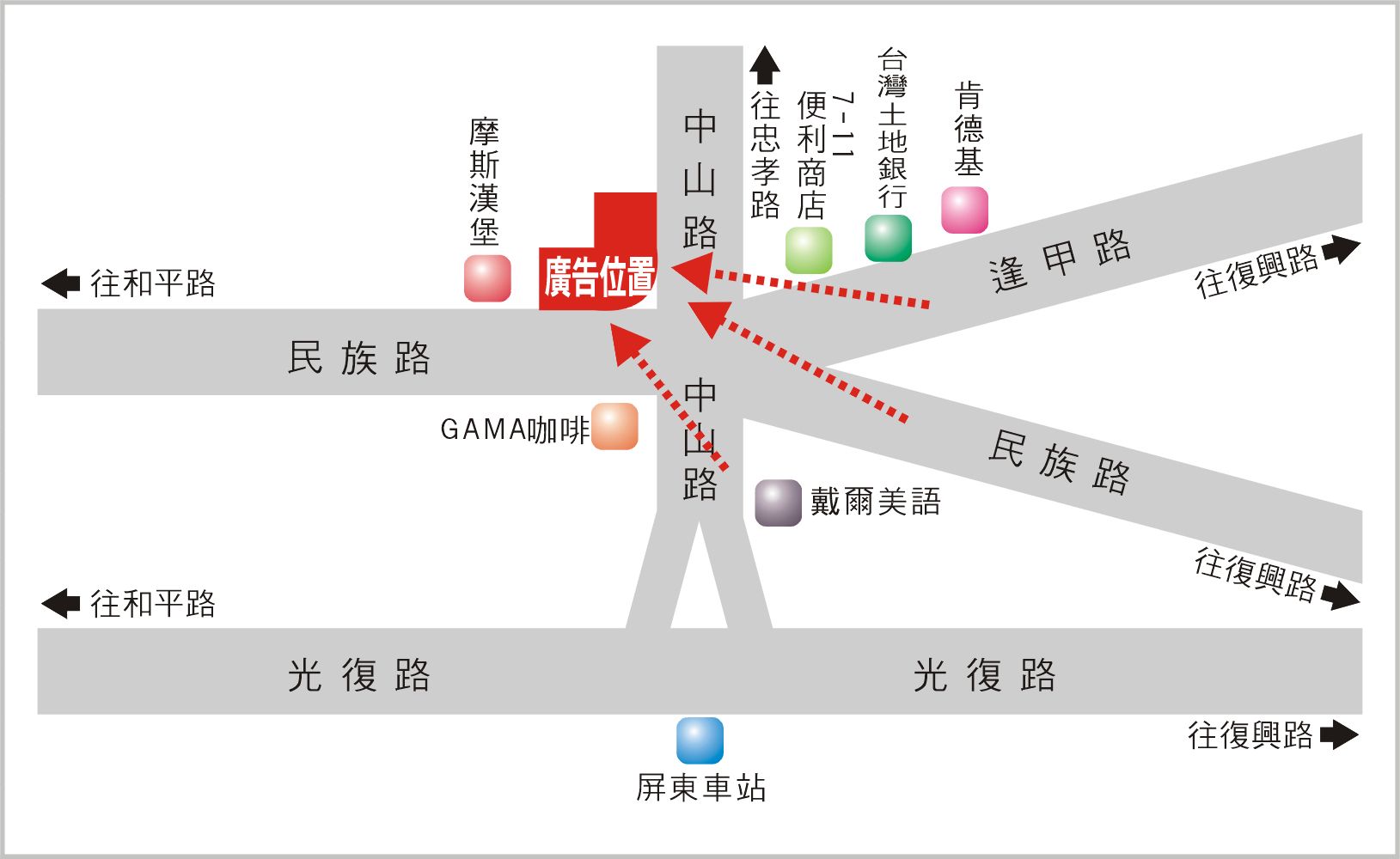 版面位於屏東車站前中山路及民族路口往忠孝路及和平路方向收視,此路段為連接忠孝路、光復路、復興路及和平路的主要道路之一,腹地為屏東車站,交通流量及往來車潮、人潮頻繁,其廣告版面位置醒目,凡行經該路段之人車皆能清楚收視,是戶外定點廣告投資的絕佳地段。