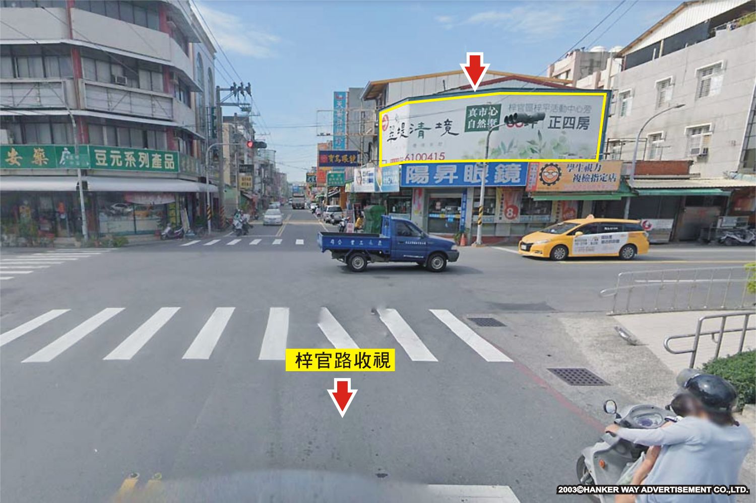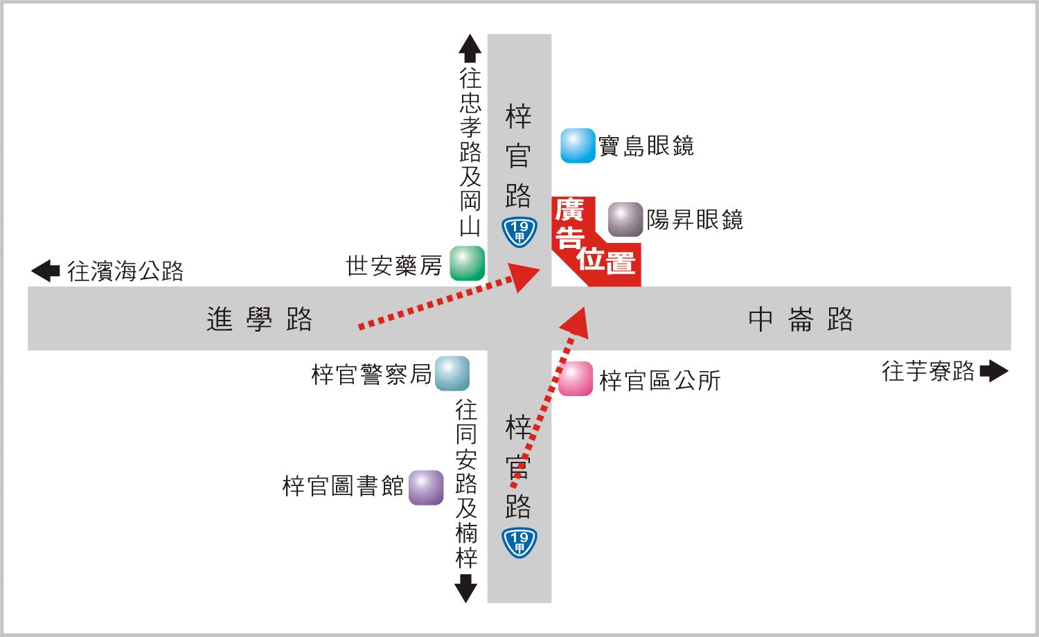 版面位於梓官路與中崙路口往芋寮路及忠孝路方向收視,此路段為連接濱海公路、芋寮路、忠孝路及同安路的主要道路之一,交通流量及往來車潮、人潮頻繁,其廣告版面位置醒目,凡行經該路段之人車皆能清楚收視,是戶外定點廣告投資的絕佳地段。