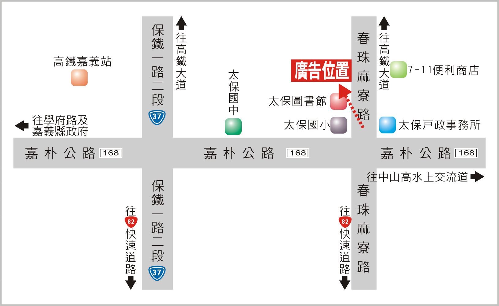 版面位於嘉義縣太保市春珠麻寮路往往高鐵大道方向收視,此路段為連接高鐵大道、嘉朴公路及82快速道路的主要道路之一,腹地為高鐵嘉義站及太保戶政事務所等,交通流量及往來車潮、人潮頻繁,其廣告版面位置醒目,凡行經該路段之人車皆能清楚收視,是戶外定點廣告投資的絕佳地段。