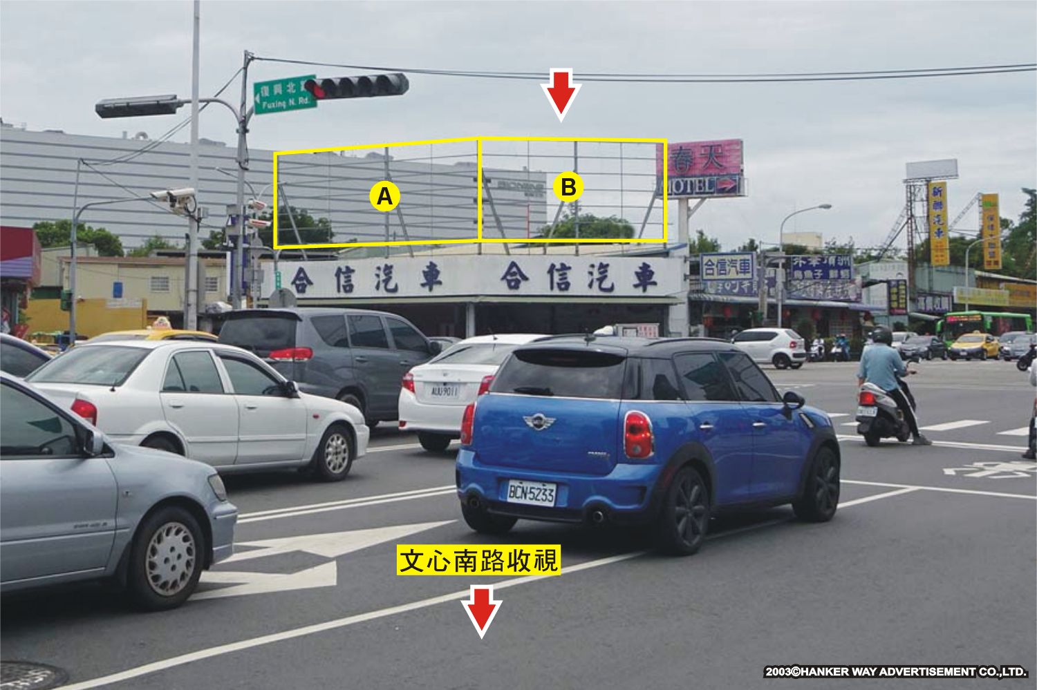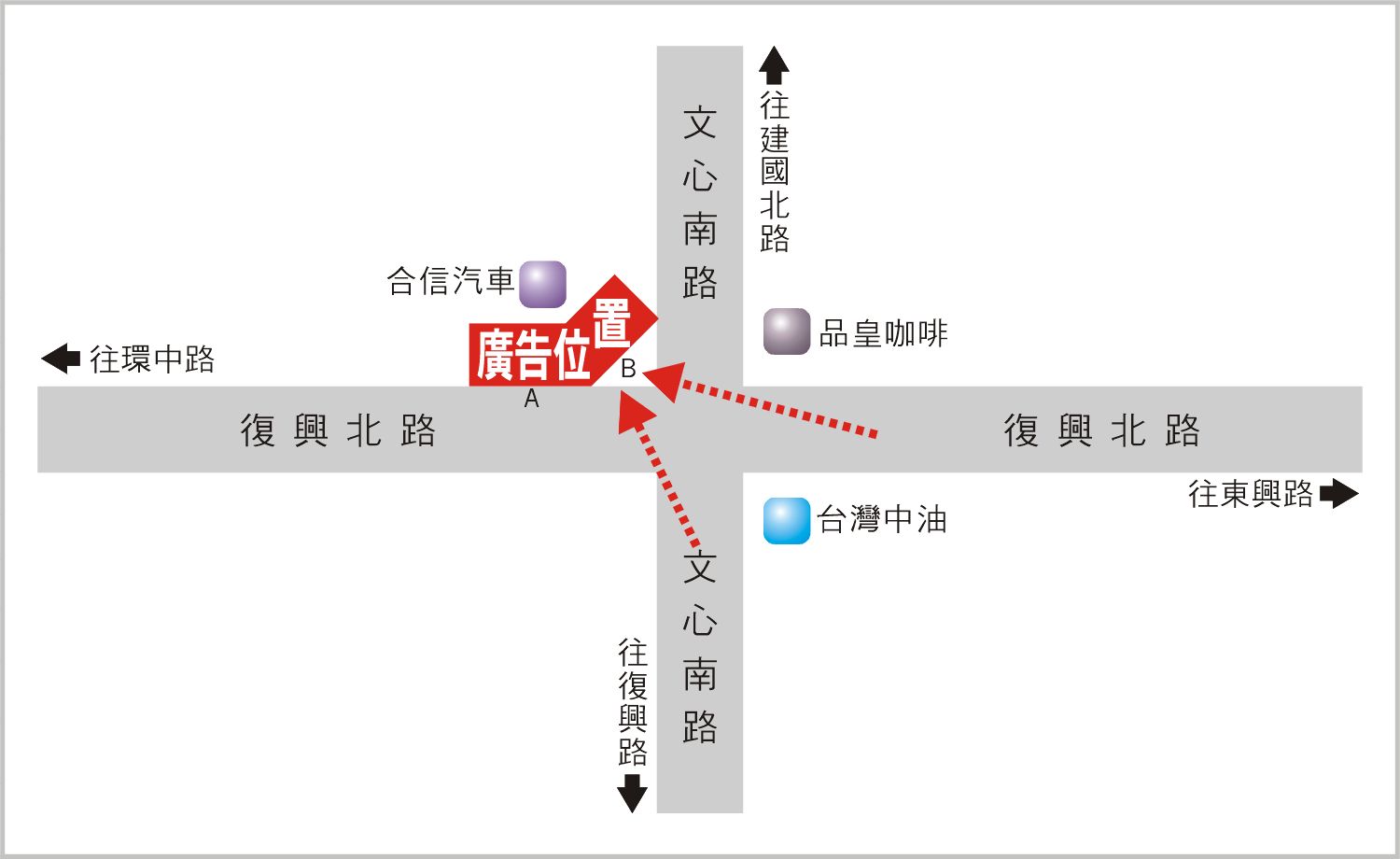 版面位於文心南路與復興北路口往建國北路及環中路方向收視,此路段為連接建國北路、復興路、環中路及東興路的主要道路之一,交通流量及往來車潮、人潮頻繁,其廣告版面位置醒目,凡行經該路段之人車皆能清楚收視,是戶外定點廣告投資的絕佳地段。