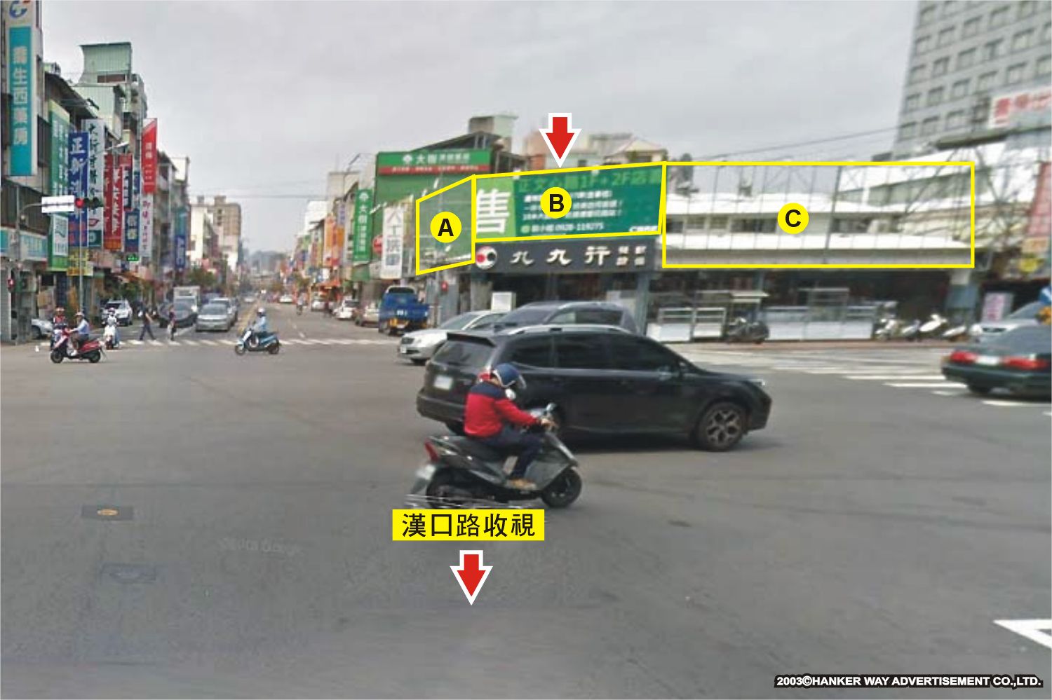 版面位於中清路與漢口路口往文心路與西屯路方向收視,此路段為連接進化北路、文心路、西屯路及崇德路的主要道路之一,交通流量及往來車潮、人潮頻繁,其廣告版面位置醒目,凡行經該路段之人車皆能清楚收視,是戶外定點廣告投資的絕佳地段。