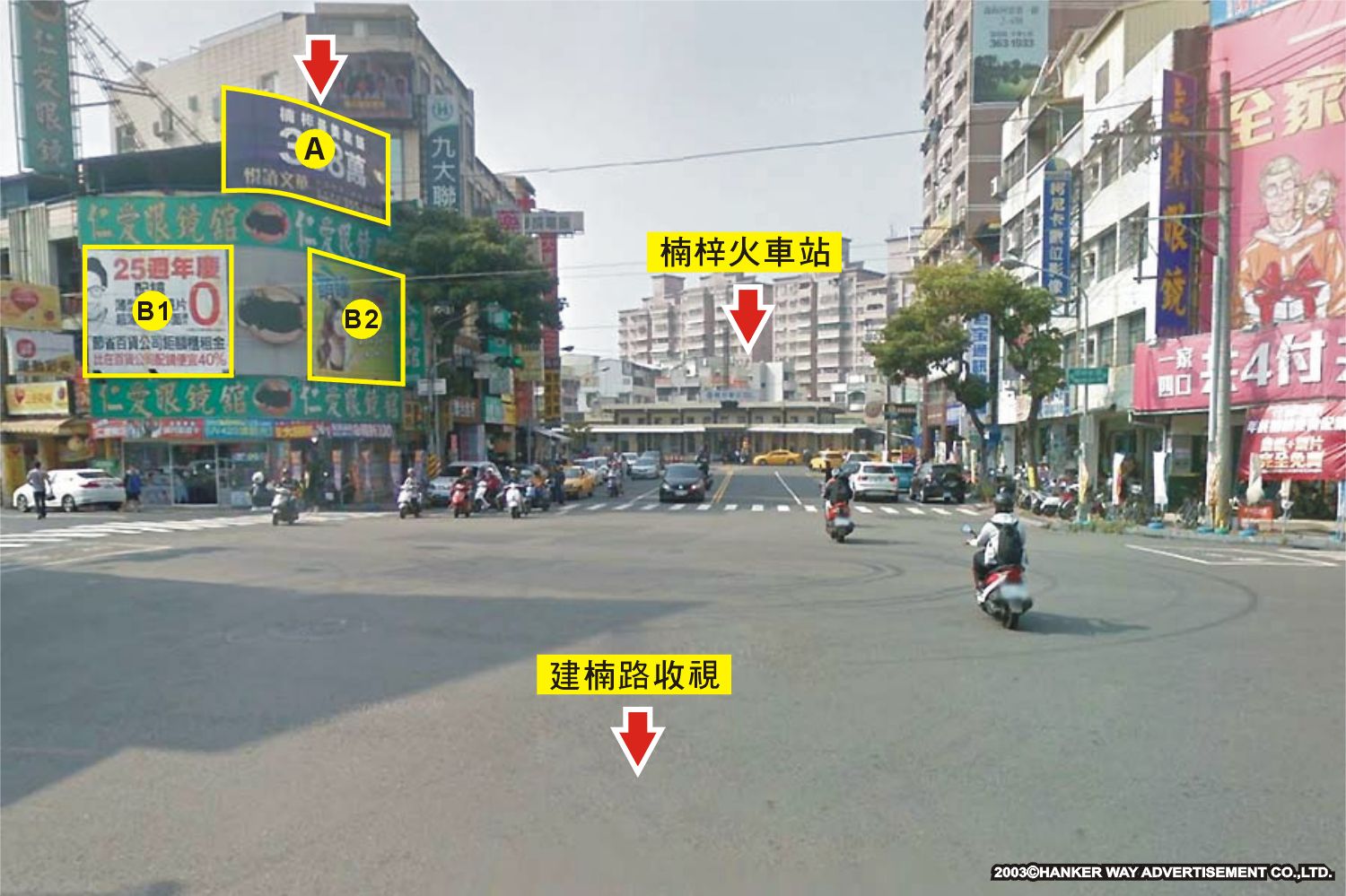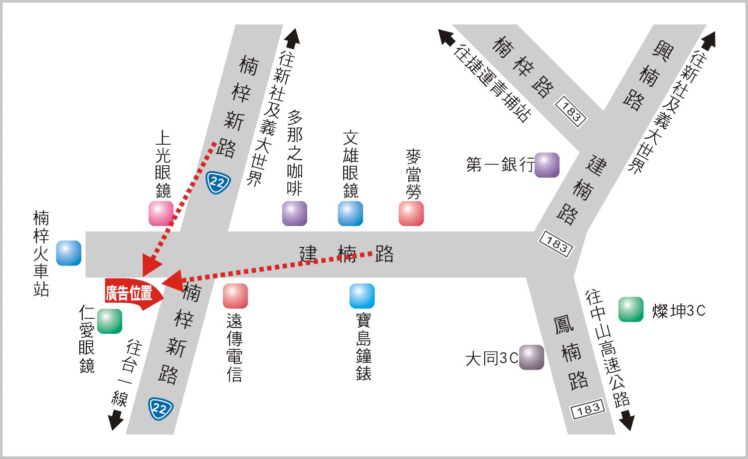 版面位於楠梓新路與建楠路口往楠梓火車站及台一線方向收視,此路段台22線楠梓段,連接新社、義大世界及楠梓火車站的主要道路之一,交通流量及往來車潮、人潮頻繁,其廣告版面位置醒目,凡行經該路段之人車皆能清楚收視,是戶外定點廣告投資的絕佳地段。