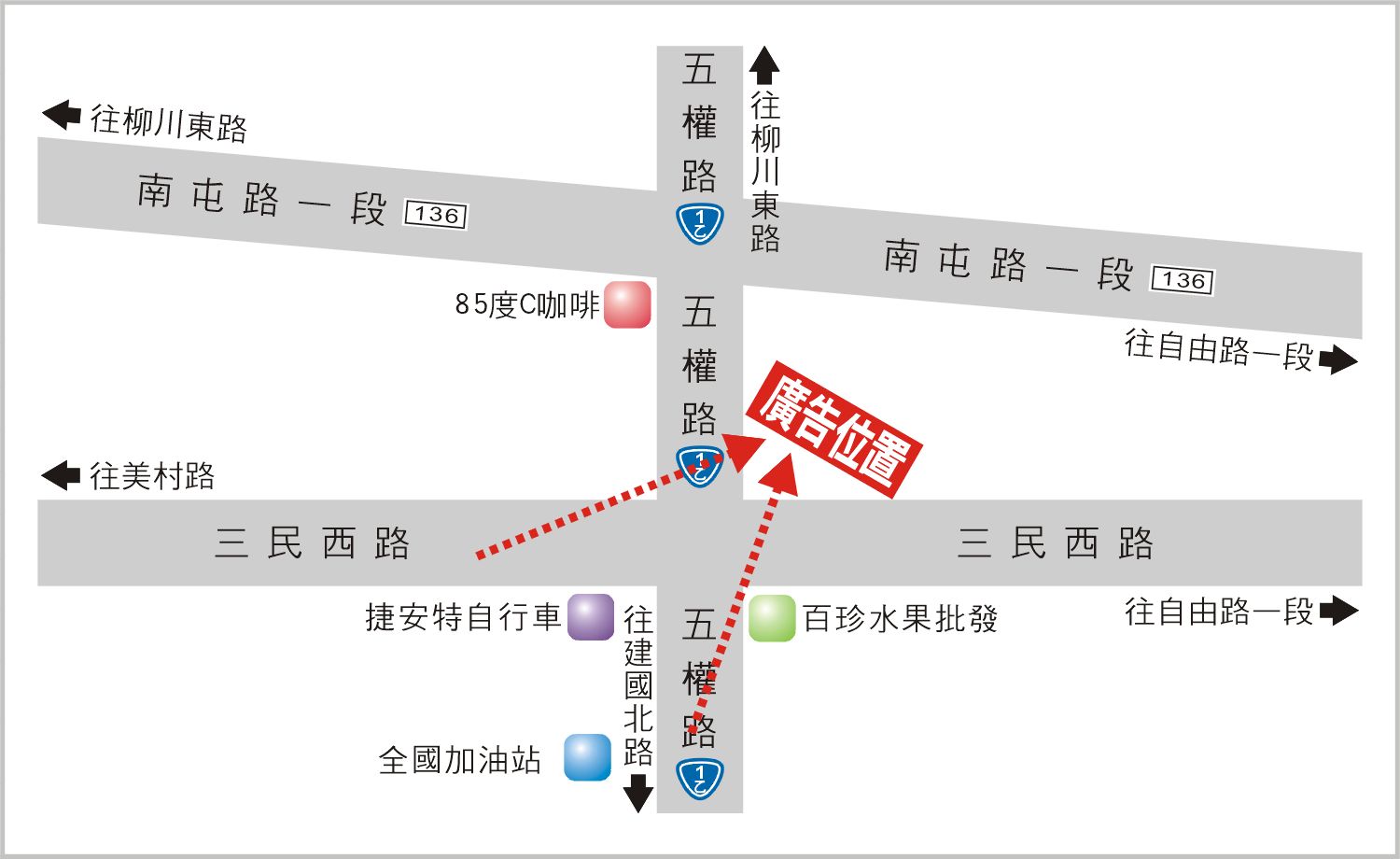 版面位於五權路與三民西路口往柳川東路及自由路一段方向收視,此路段為連接建國北路、柳川東路及美村路的主要道路之一,交通流量及往來車潮、人潮頻繁,其廣告版面位置醒目,凡行經該路段之人車皆能清楚收視,是戶外定點廣告投資的絕佳地段。