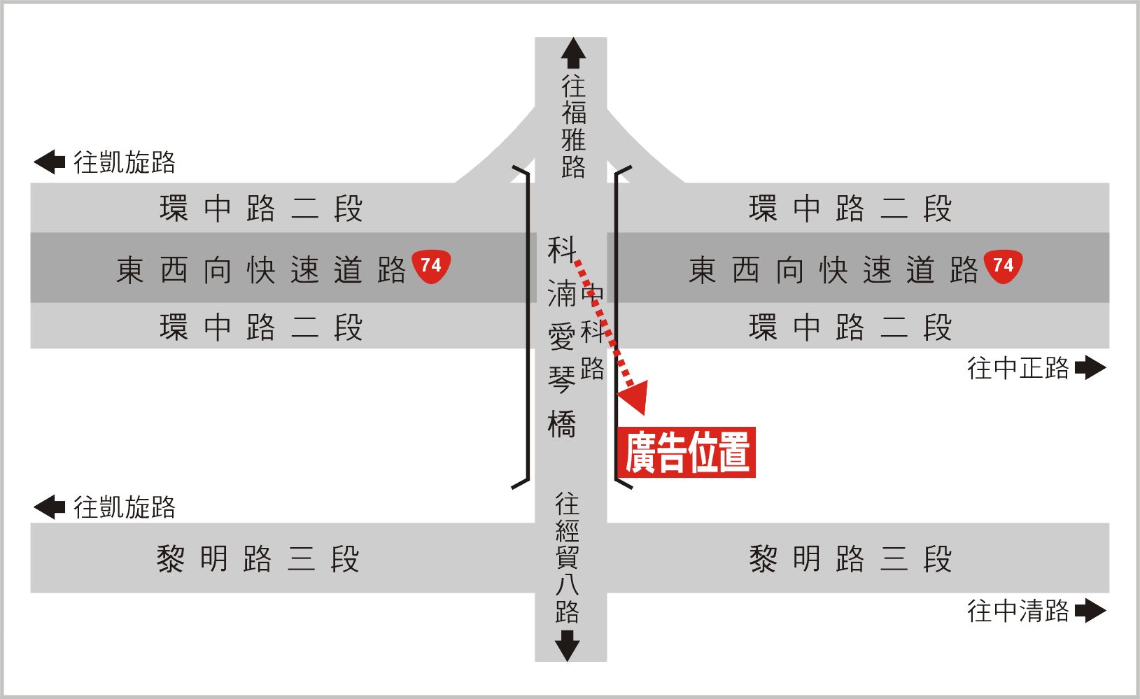 版面位於中科路科湳愛琴橋往黎明路三段方向收視,此路段為連接福雅路及黎明路的主要道路之一,交通流量及往來車潮、人潮頻繁,其廣告版面位置醒目,凡行經該路段之人車皆能清楚收視,是戶外定點廣告投資的絕佳地段。