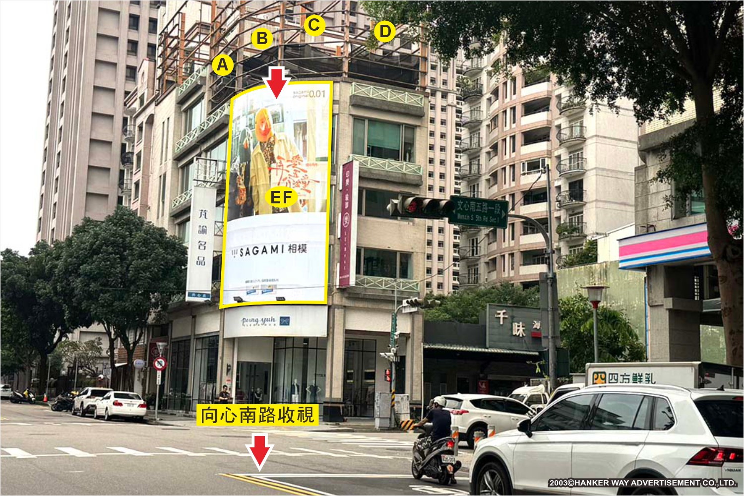 版面位於文心南五路及向心南路口往公益路及文心南路方向收視,此路段為連黎明路、文心南路、公益路及文心南七路的主要道路之一,交通流量及往來車潮、人潮頻繁,其廣告版面位置醒目,凡行經該路段之人車皆能清楚收視,是戶外定點廣告投資的絕佳地段。