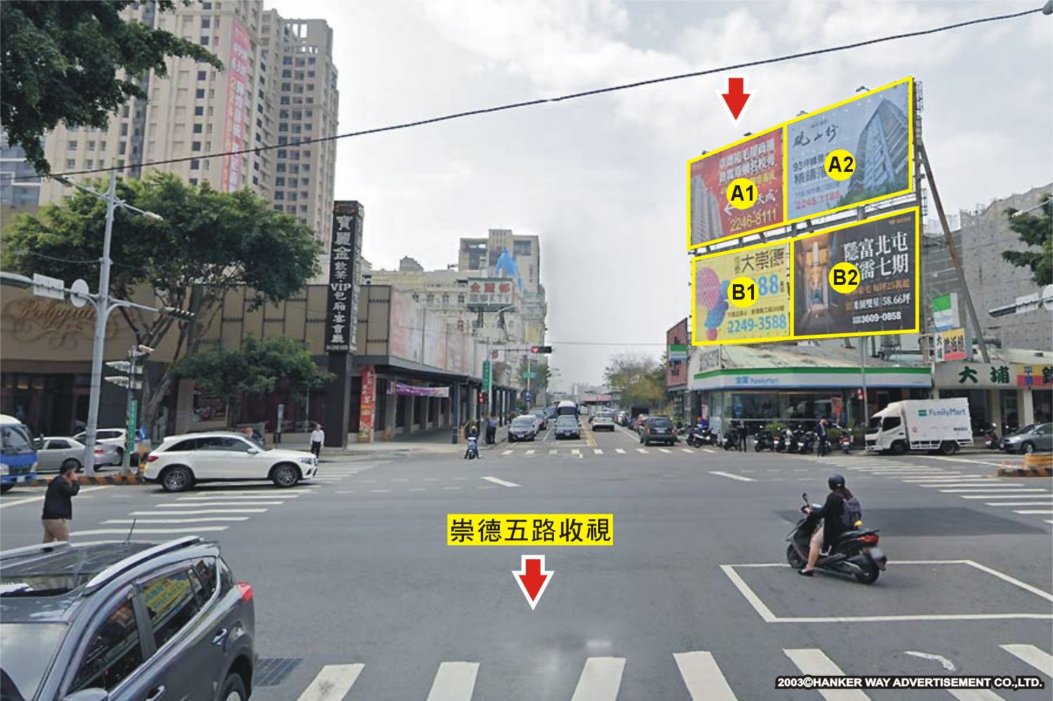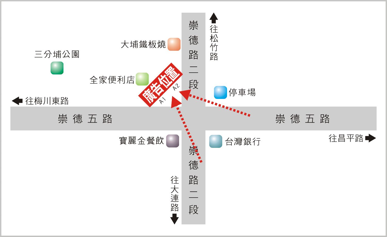 版面位於崇德路二段與崇德五路口往柳川東路及松竹路方向收視,此路段為連接柳川東路、昌平路、松竹路及大連路的主要道路之一,交通流量及往來車潮、人潮頻繁,其廣告版面位置醒目,凡行經該路段之人車皆能清楚收視,是戶外定點廣告投資的絕佳地段。
