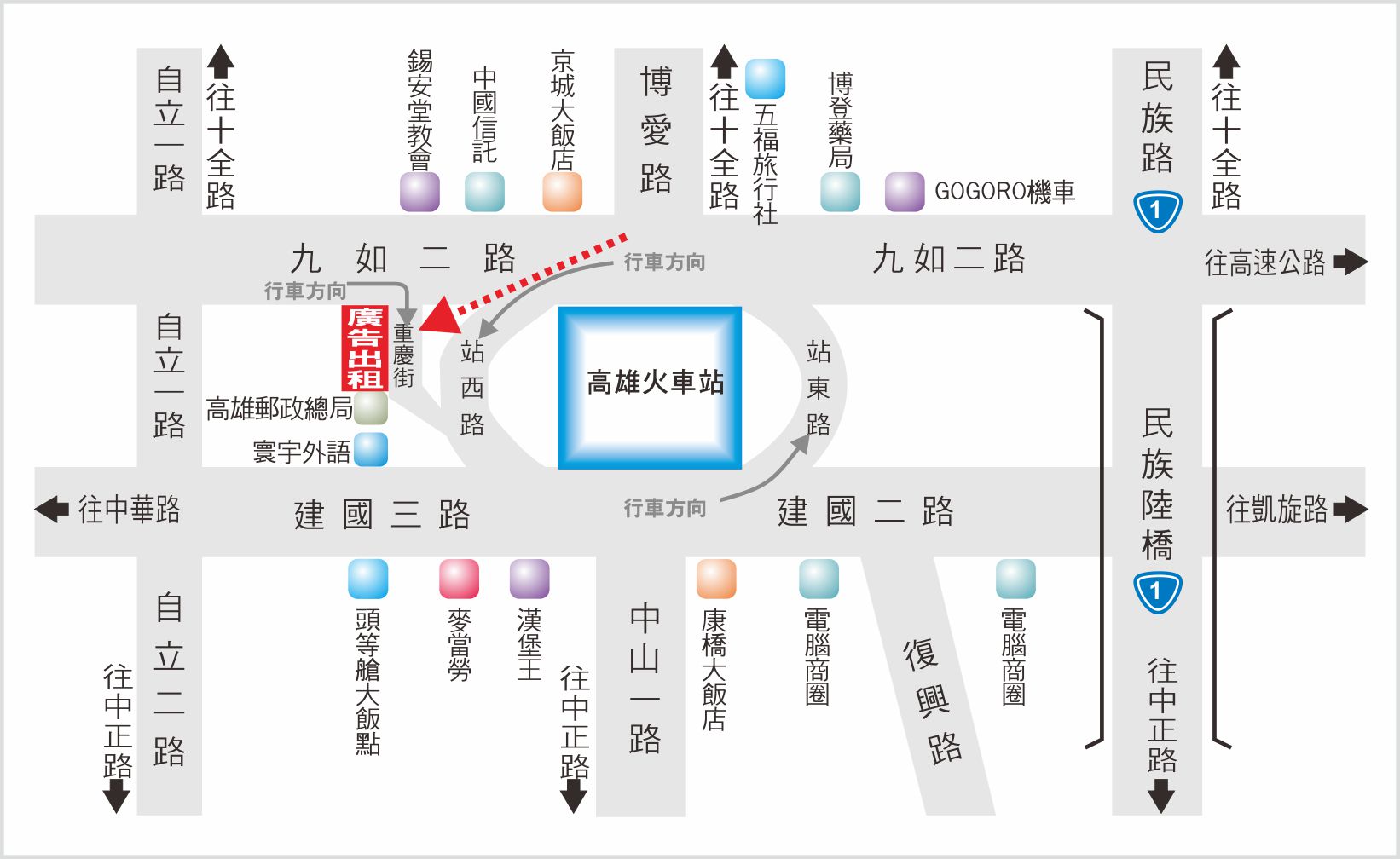版面位於高雄後火車站旁站西路口往中華路及建國路收視,腹地高雄市火車站、高雄市公車站、台汽客運及商店街、服飾店及電腦商圈等等,附近商圈林立,往來車潮、人潮都相當頻繁,其廣告版面位置醒目,是戶外定點廣告投資的絕佳地段。