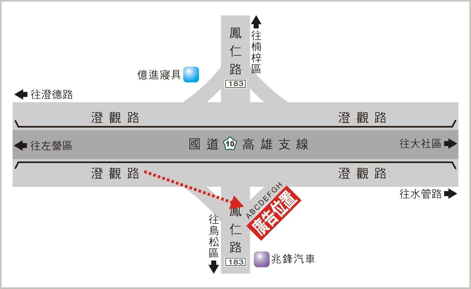 版面位於仁武區澄觀路與鳳仁路口往水管路方向收視,此路段為連接水管路、澄德路、楠梓區及鳥松區的主要道路之一,交通流量及往來車潮、人潮頻繁,其廣告版面位置醒目,凡行經該路段之人車皆能清楚收視,是戶外定點廣告投資的絕佳地段。