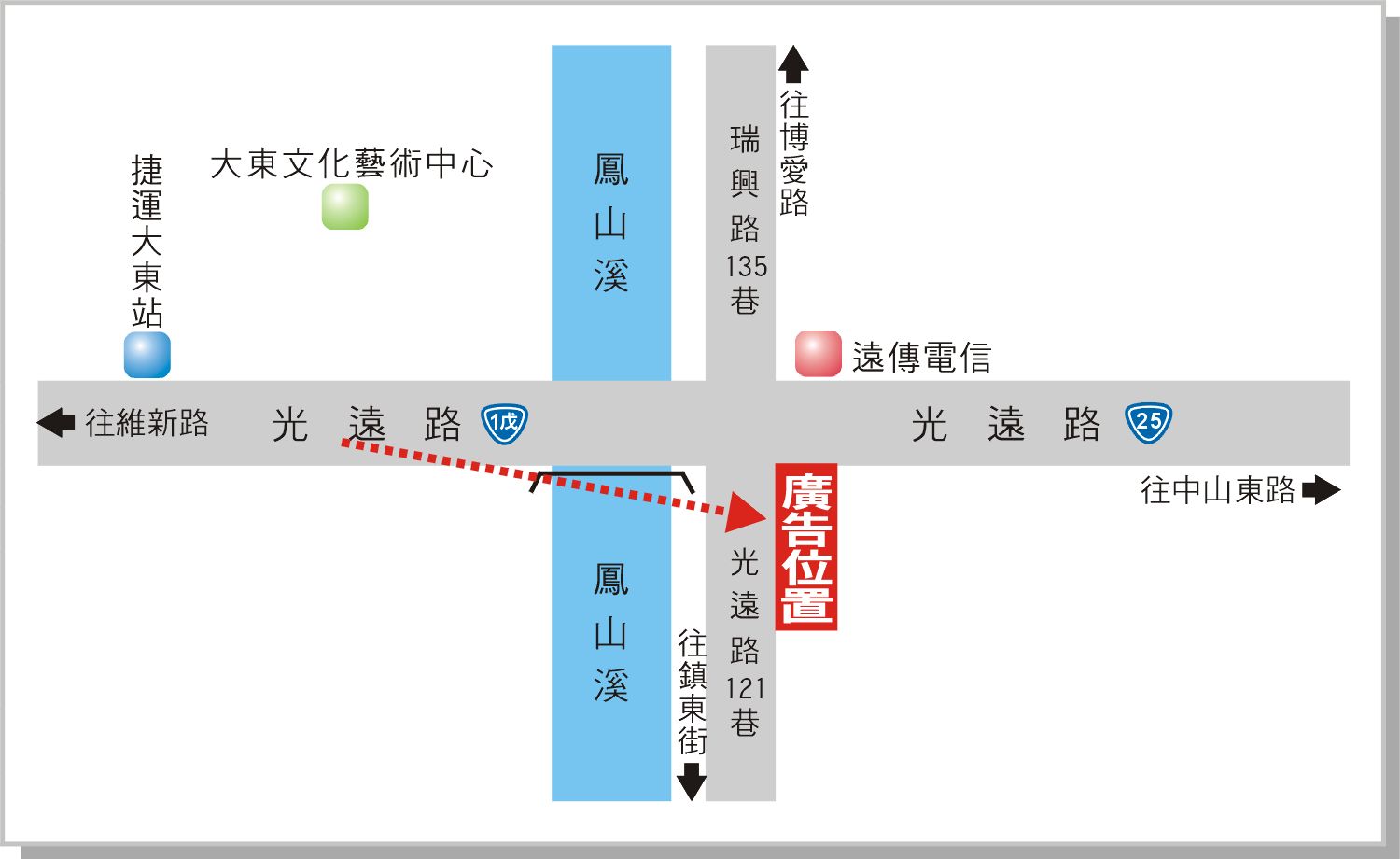 版面位於光遠路往中山東路與方向收視,此路段為連接鳳山市區、維新路及中山東路的主要道路之一,交通流量及往來車潮人潮頻繁,其廣告版面位置醒目,凡行經該路段之人車皆能清楚收視,是戶外定點廣告投資的絕佳地段。