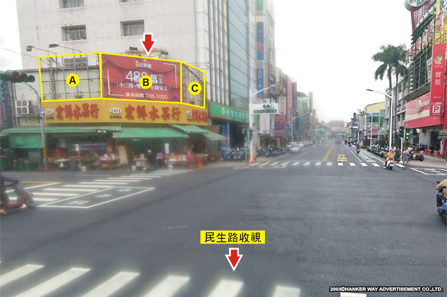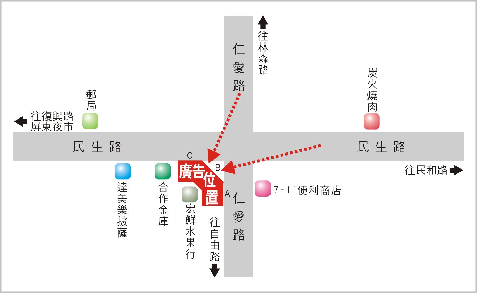 版面位於民生路與仁愛路口往復興路及自由路方向收視,此路段為連接復興路、屏東夜市、民和路、自由路及林森路的主要道路之一,交通流量及往來車潮、人潮頻繁,其廣告版面位置醒目,凡行經該路段之人車皆能清楚收視,是戶外定點廣告投資的絕佳地段。