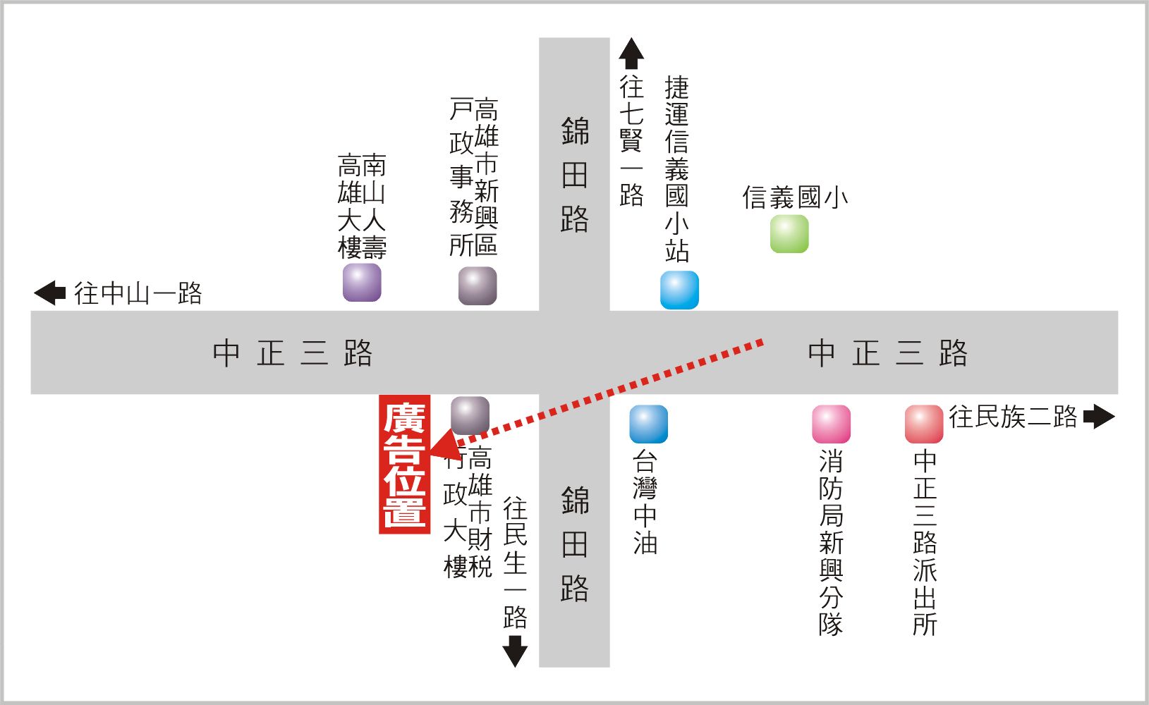 版面位於中正三路與錦田路口往中山一路方向收視,此路段為連接中山一路、民族一路、民生一路及七賢一路的主要道路之一,交通流量及往來車潮、人潮頻繁,其廣告版面位置醒目,凡行經該路段之人車皆能清楚收視,是戶外定點廣告投資的絕佳地段。