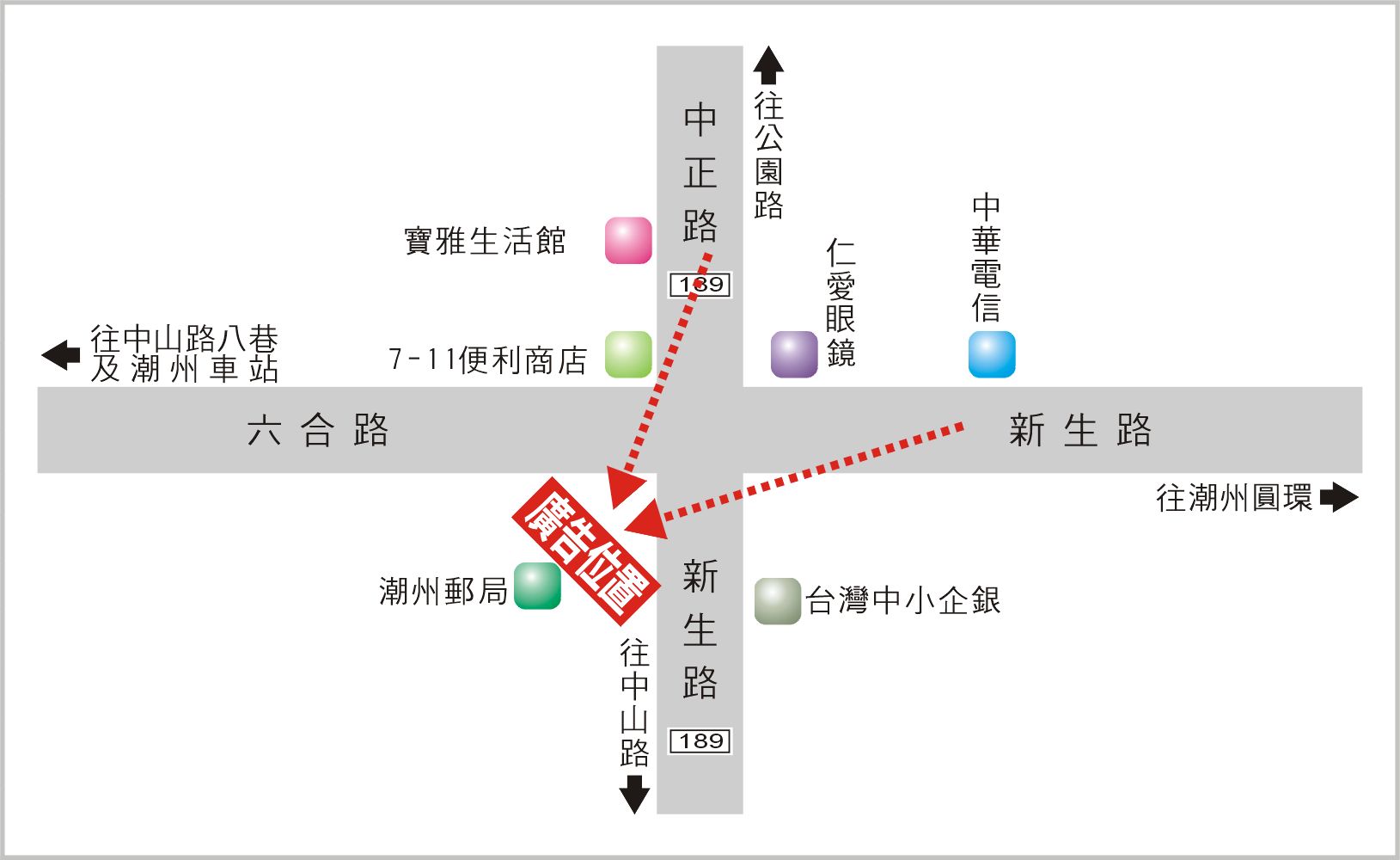版面位於潮州鎮新生路與六合路口往中山路及潮州車站方向收視,此路段為連接中山路、公園路、潮州圓環、中山路八巷及潮州車站的主要道路之一,交通流量及往來車潮、人潮頻繁,其廣告版面位置醒目,凡行經該路段之人車皆能清楚收視,是戶外定點廣告投資的絕佳地段。