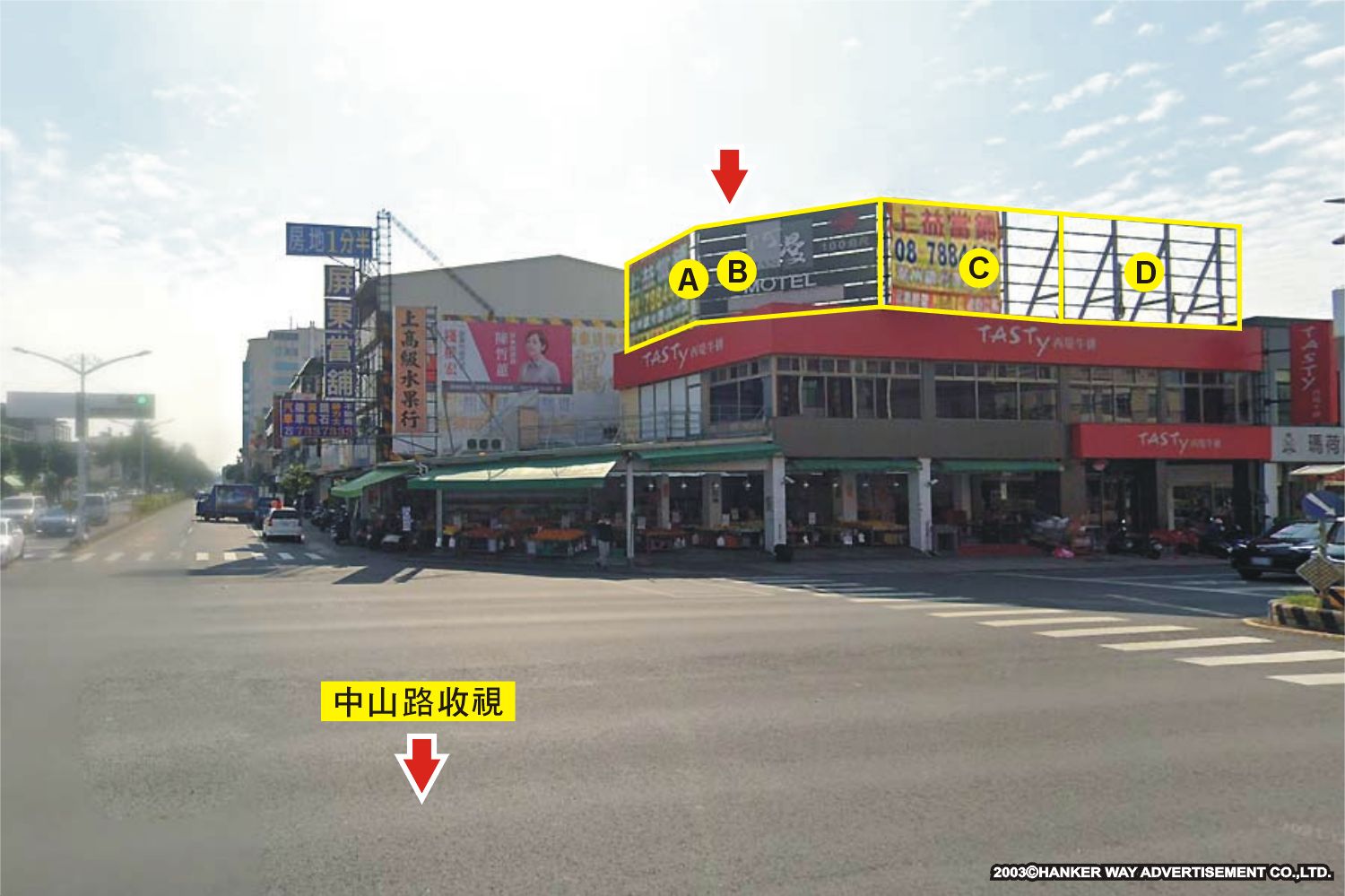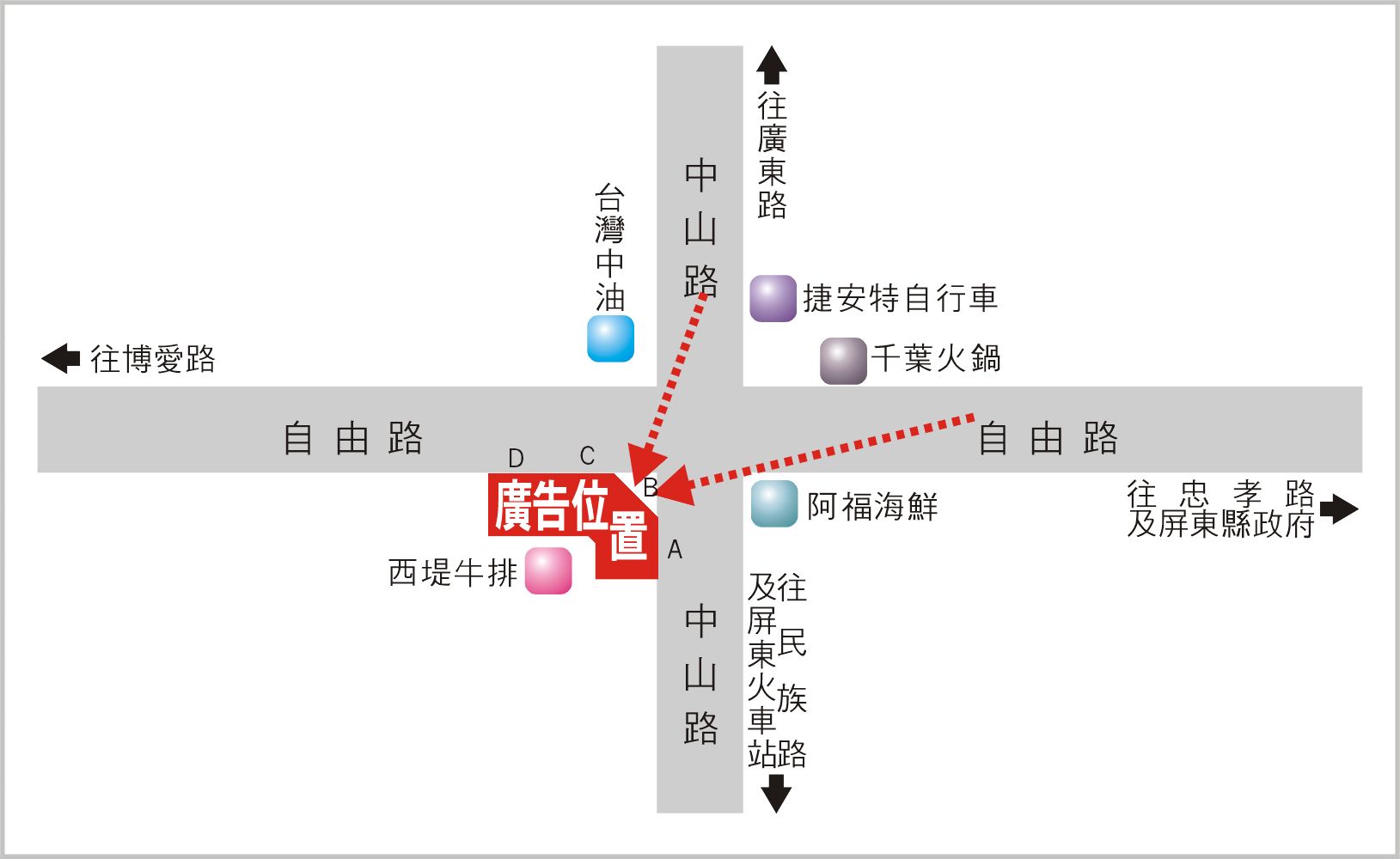 版面位於中山路與自由路口往民路及博愛路方向收視,此路段為連接廣東路、民族路、博愛路及忠孝路的主要道路之一,交通流量及往來車潮、人潮頻繁,其廣告版面位置醒目,凡行經該路段之人車皆能清楚收視,是戶外定點廣告投資的絕佳地段。