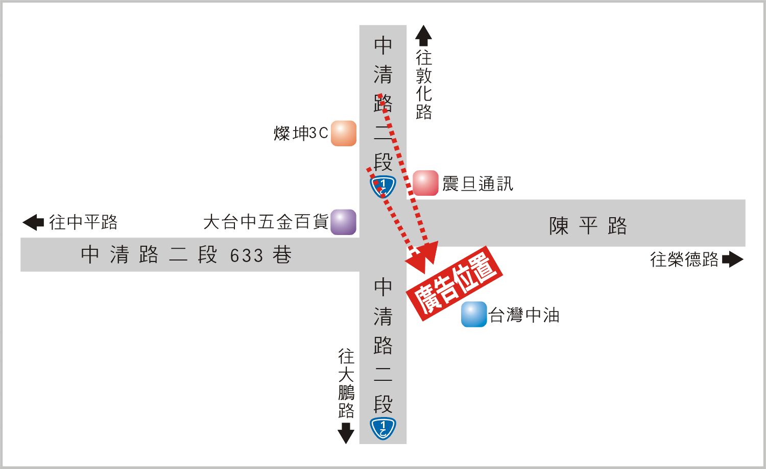 版面位於中清路二段與陳平路口往大鵬路方向收視,此路段為台一乙線台中段,連接大鵬路、敦化路、榮德路及中平路的主要道路之一,交通流量及往來車潮、人潮頻繁,其廣告版面位置醒目,凡行經該路段之人車皆能清楚收視,是戶外定點廣告投資的絕佳地段。