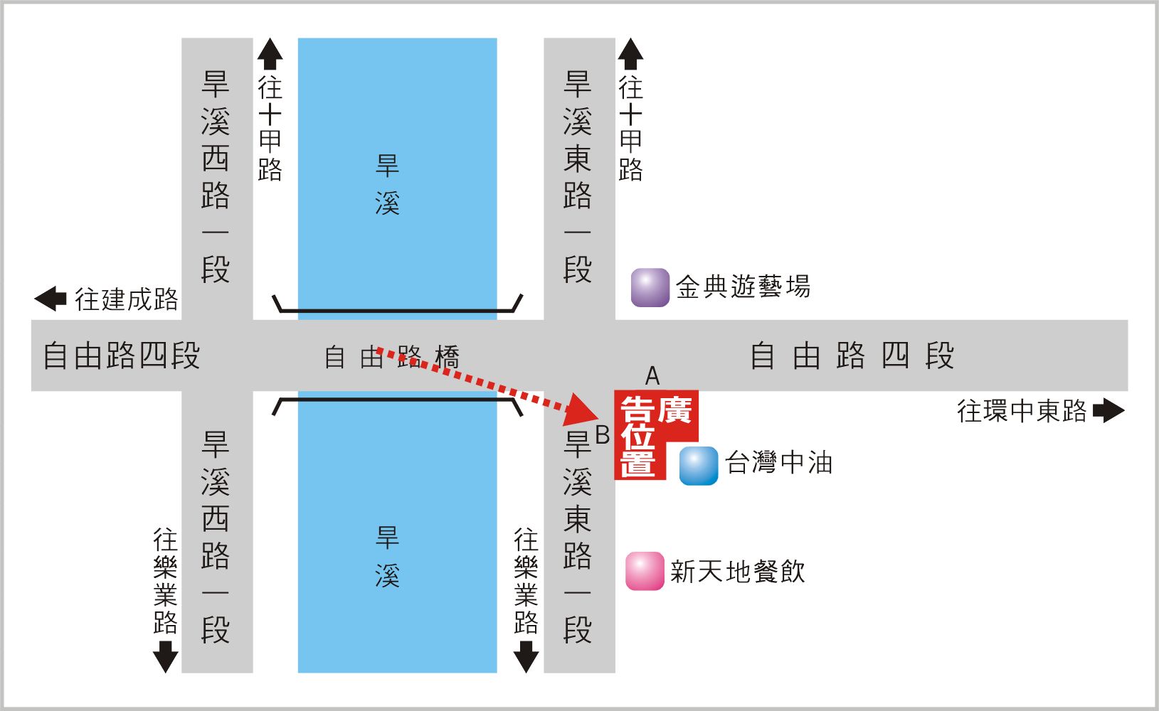 版面位於自由路四段與旱溪東路口往環中東路方向收視,此路段為連接環中東路、建成路、十甲路及樂業路的主要道路之一,交通流量及往來車潮、人潮頻繁,其廣告版面位置醒目,凡行經該路段之人車皆能清楚收視,是戶外定點廣告投資的絕佳地段。