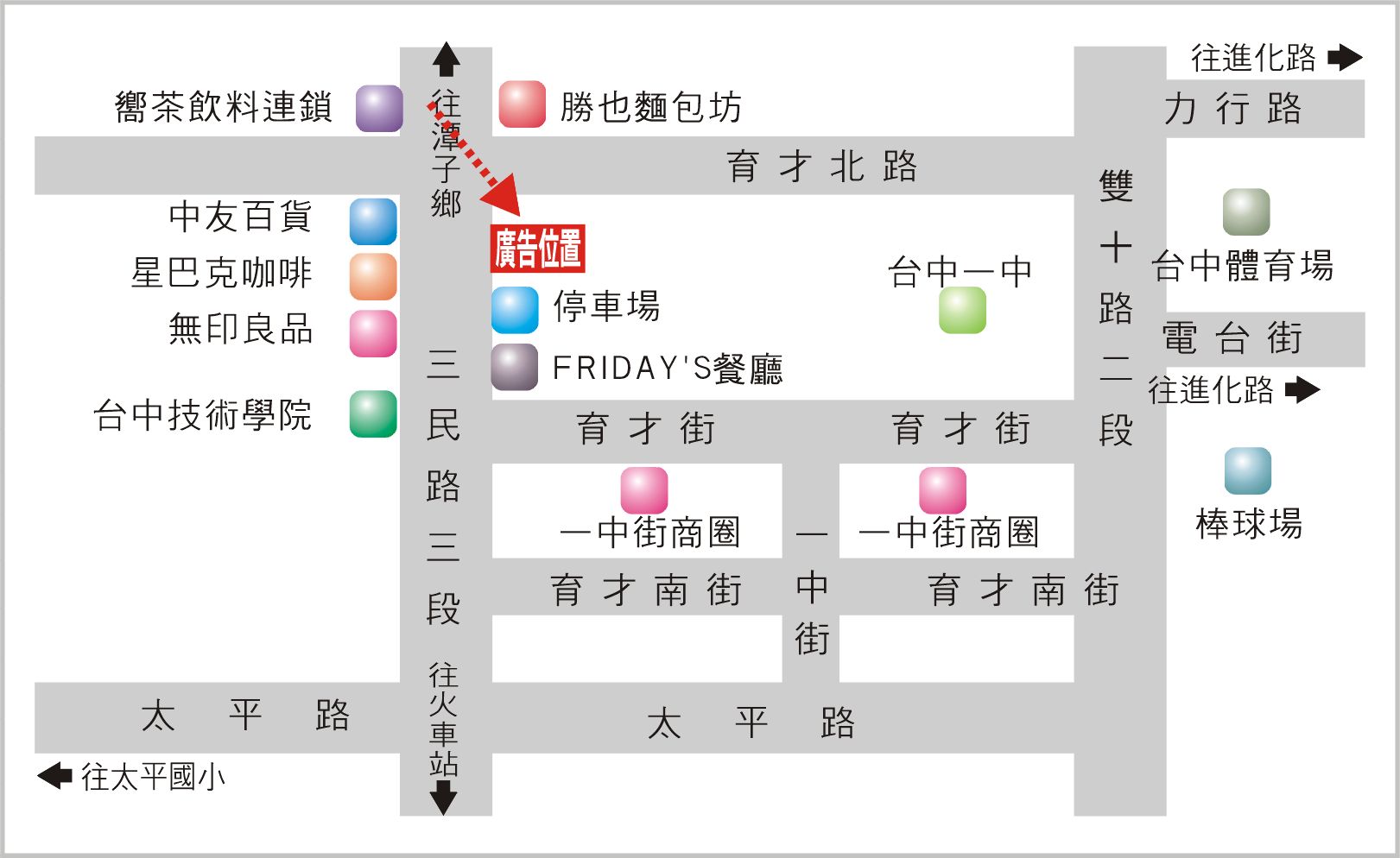 版面位於中友百貨對面商圈,腹地為中友百貨、中友百貨商圈、台中技術學院、好樂迪KTV等,消費人潮都相當頻繁,其廣告版面位置醒目,是戶外定點廣告投資的絕佳地段。