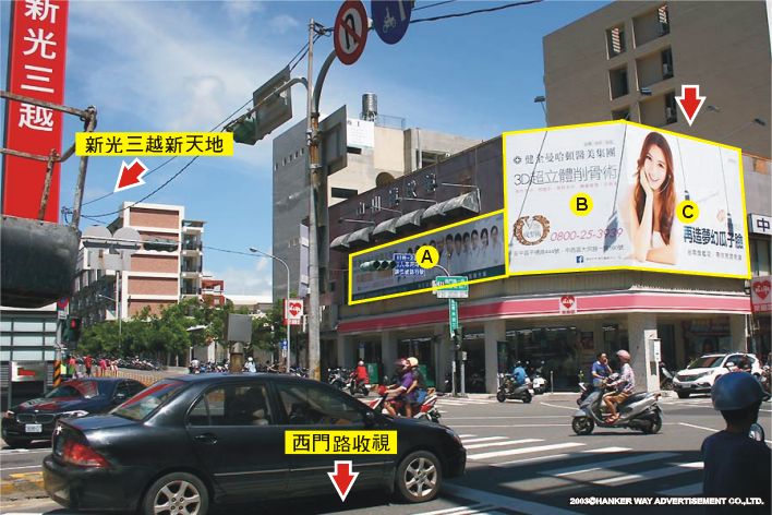 版面位於西門路與樹林街口新光三越新天地旁,腹地為新光三越、中華電信等,交通流量及往來車潮、人潮都相當頻繁,該路段商業活動熱絡,其廣告版面位置醒目,凡行經該路段之人車皆能清楚收視,是戶外定點廣告投資的絕佳地段。