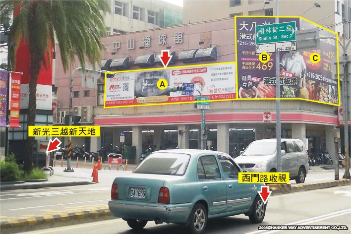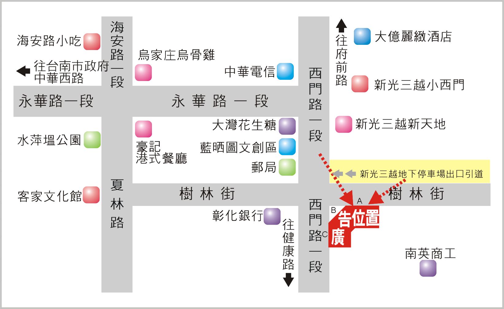 版面位於西門路與樹林街口新光三越新天地旁,腹地為新光三越、中華電信等,交通流量及往來車潮、人潮都相當頻繁,該路段商業活動熱絡,其廣告版面位置醒目,凡行經該路段之人車皆能清楚收視,是戶外定點廣告投資的絕佳地段。